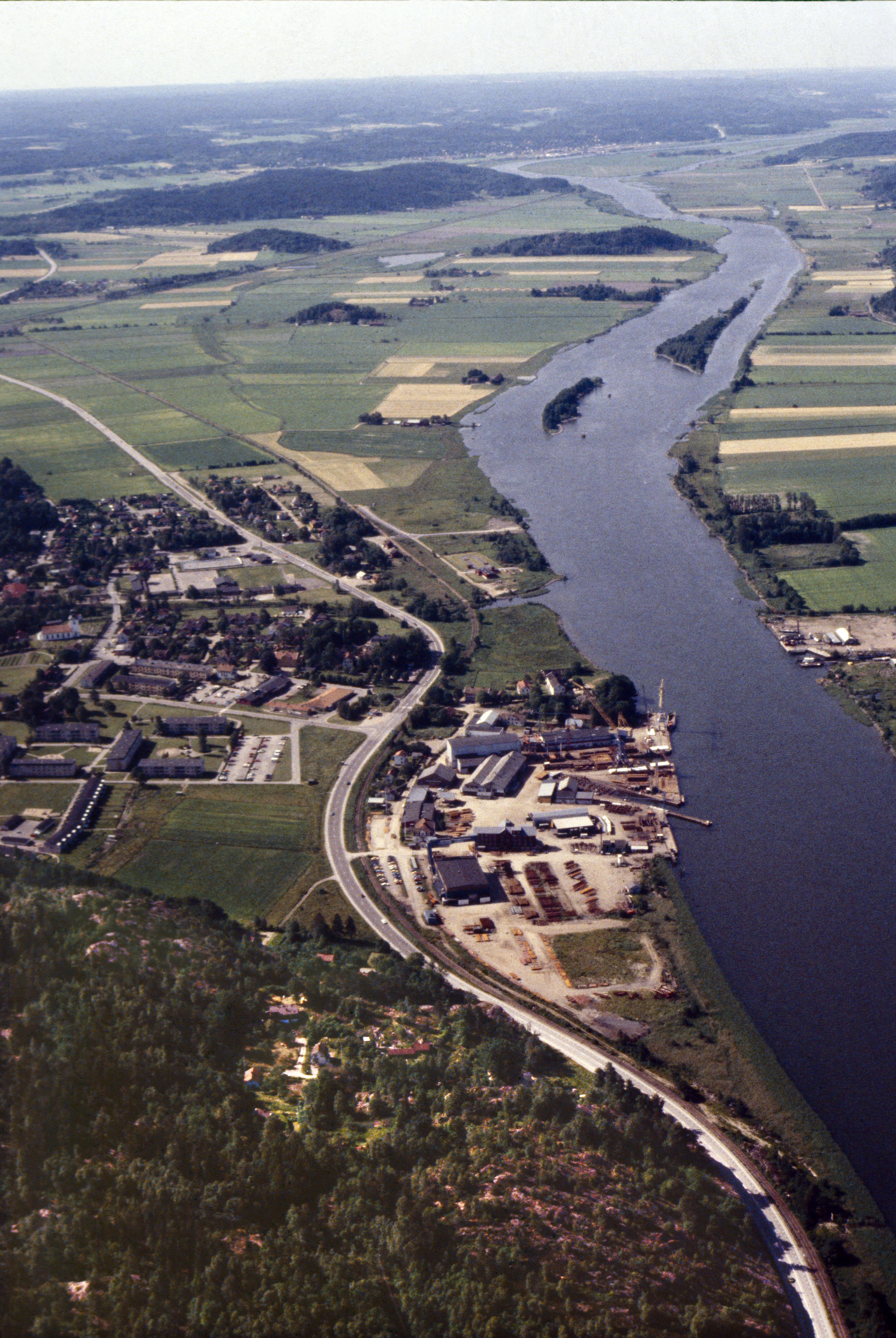 Beskrivning: Lödöse tätort vid Göta älv. Sankt Peders kyrka till vänster om bildens mitt. Bilden är tagen mot (väderstreck): S