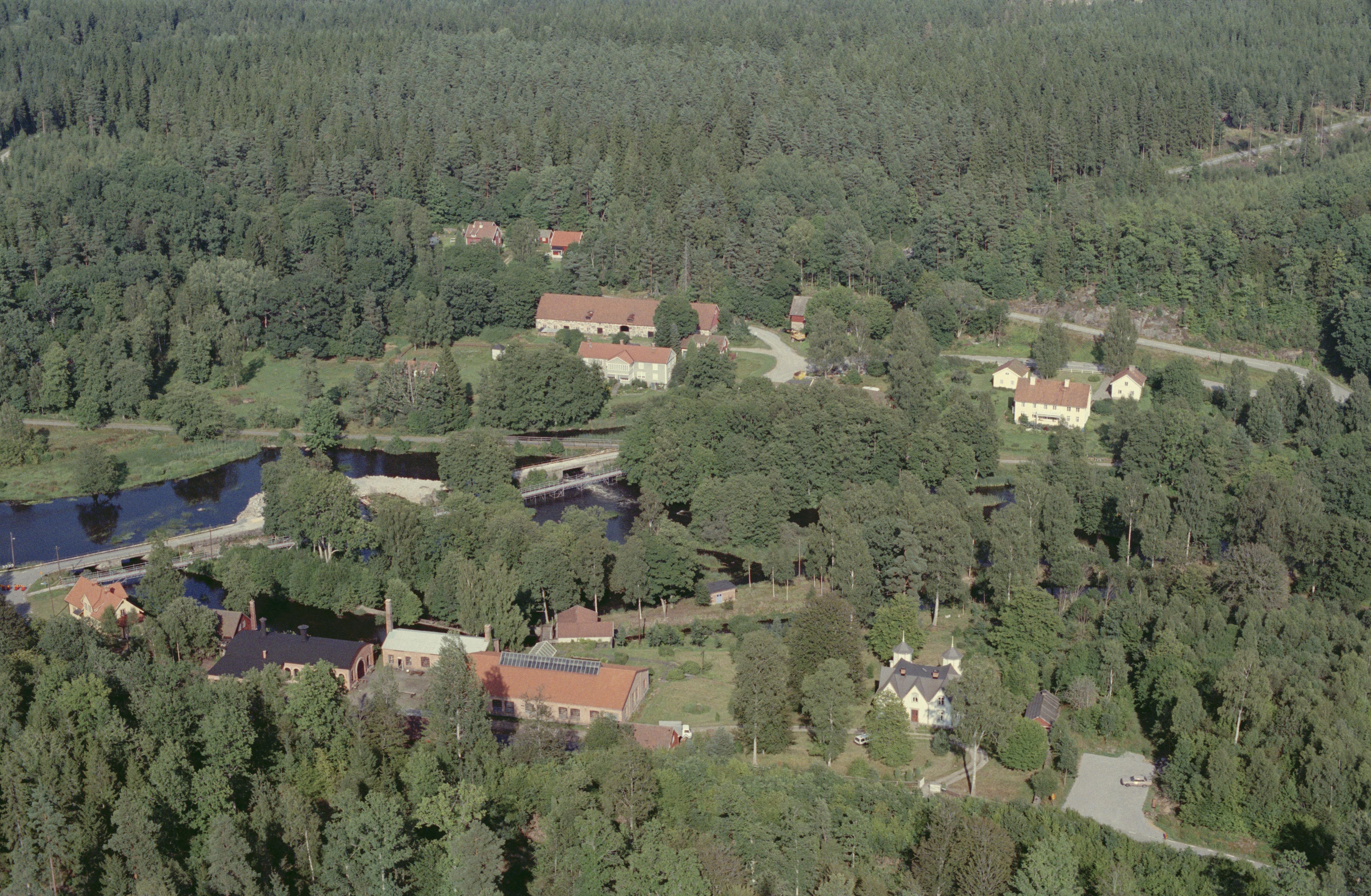 Beskrivning: Vid Mörrumsån som markerar gränsen mellan socknen Kyrkhult och Ringemåla (i bildens övre del). Ebbemåla bruk och gjuteri. Bilden är tagen mot (väderstreck): ONO