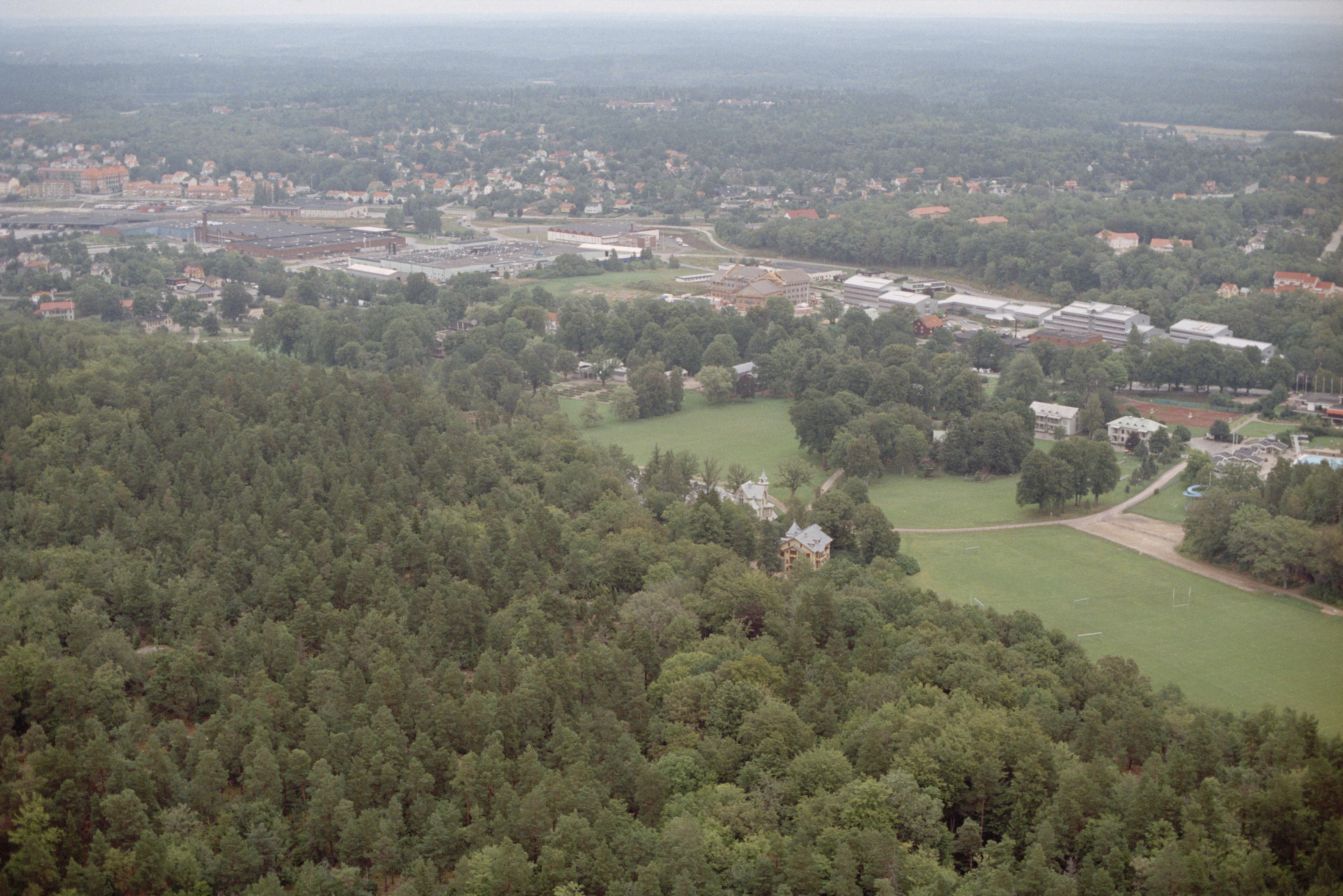Beskrivning: Ronneby brunn vid Ronnebyån. I skogen vid bildens mitt röset Östra Kumlet RAÄnr Ronneby 112:1. Området är kulturreservat och ingår i Södra Brunnsskogens naturreservat. Bilden är tagen mot (väderstreck): NO