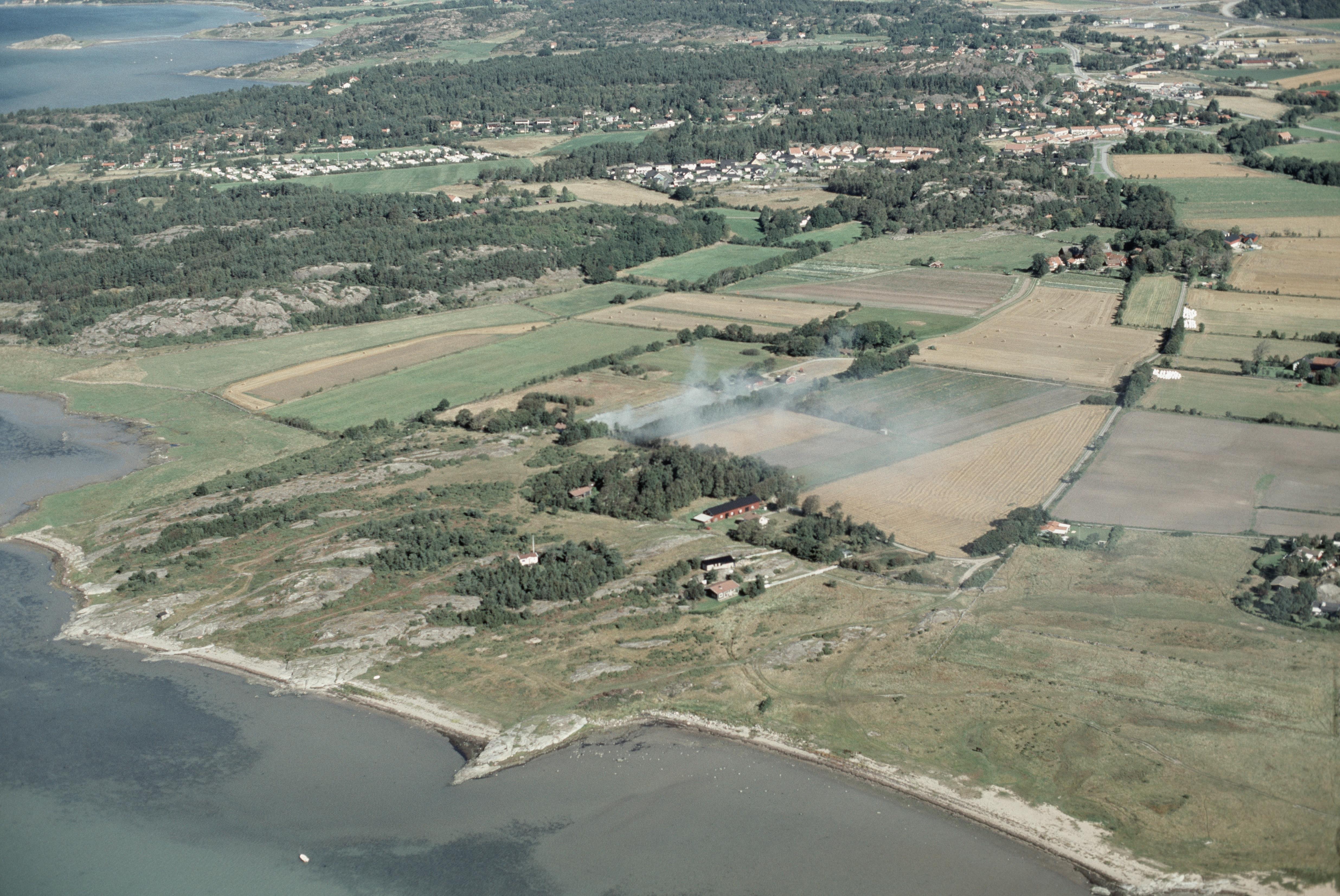 Beskrivning: Norra Anrås. Gravfält RAÄnr Jörlanda 58:1 vid Anråse åns mynning (nere till höger) i Hake fjord. I bildens övre del byn Stora Höga. Bilden är tagen mot (väderstreck): NO