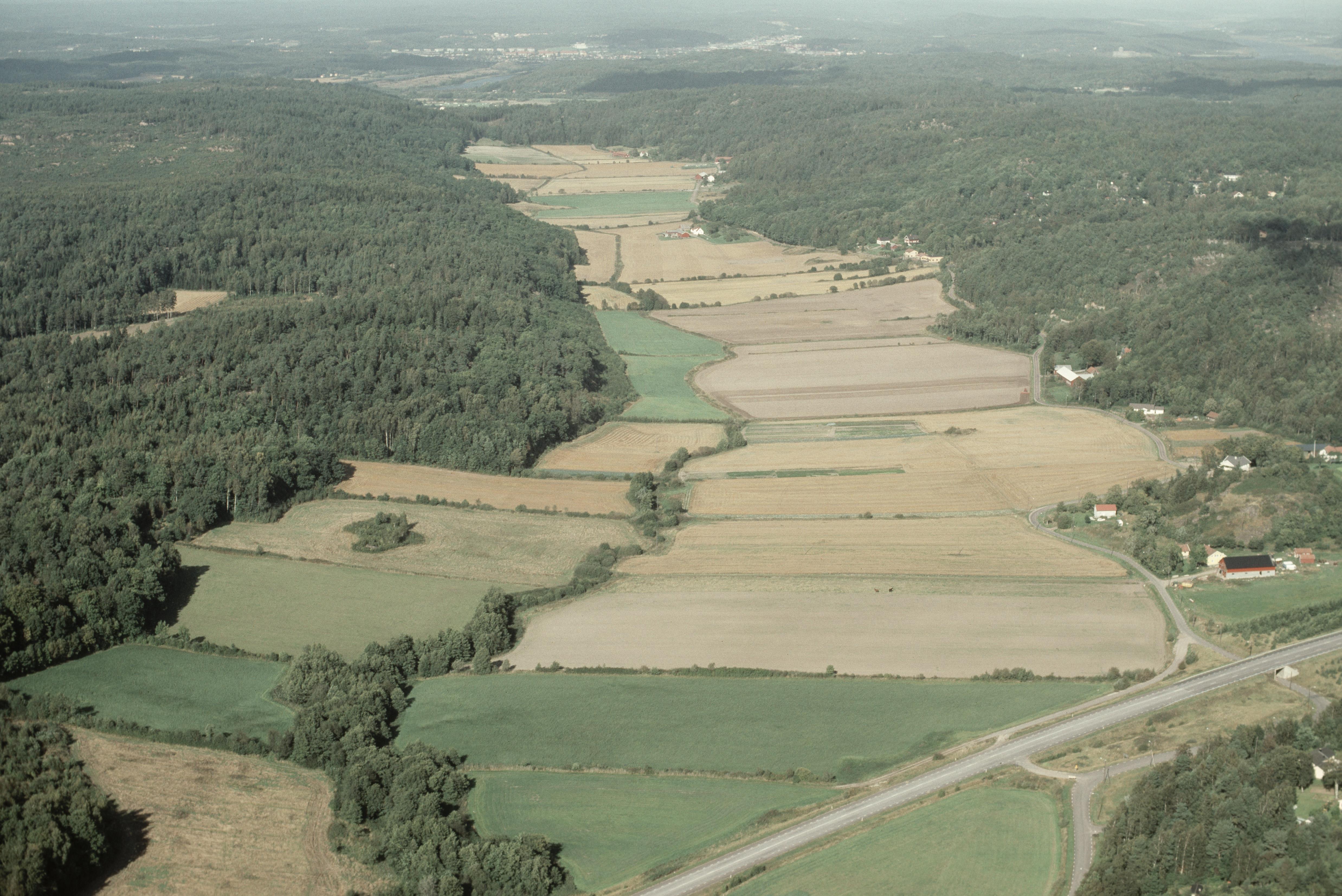 Beskrivning: Djupedalsåns dalgång. Österslätt i bildens nedre del. Uppe till höger fornborg Borres slott RAÄnr Säve 134:1 och fornborg Borres håla RAÄnr Säve 133.1. Bilden är tagen mot (väderstreck): N