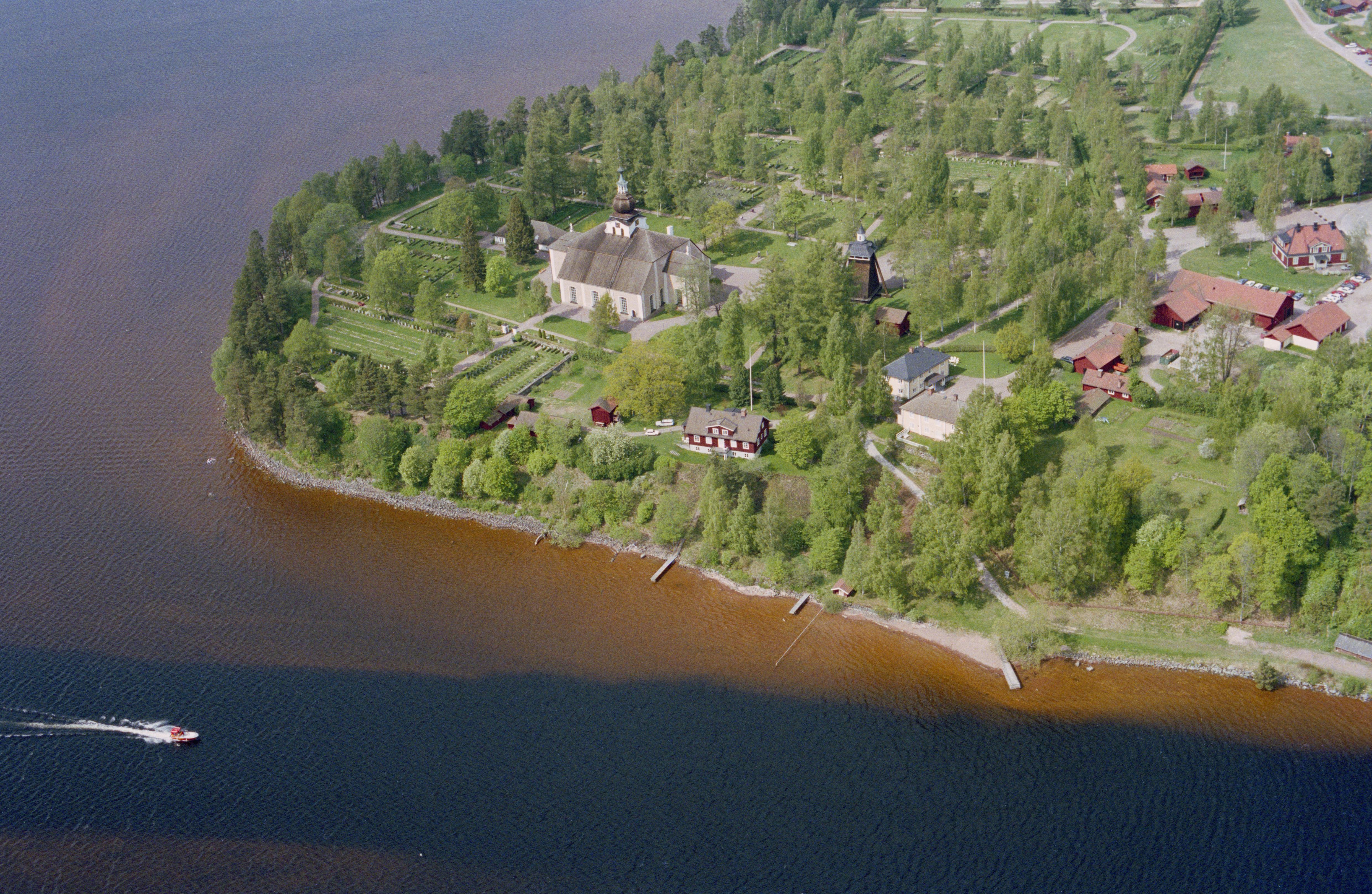 Beskrivning: Leksands tätort i området där Österdalsälven (i bildens nedre del) och Österviken i sjön Siljan möts. Leksands kyrka med gravplats RAÄnr Leksand 905:3 till vänster. Bilden är tagen mot (väderstreck): NNV