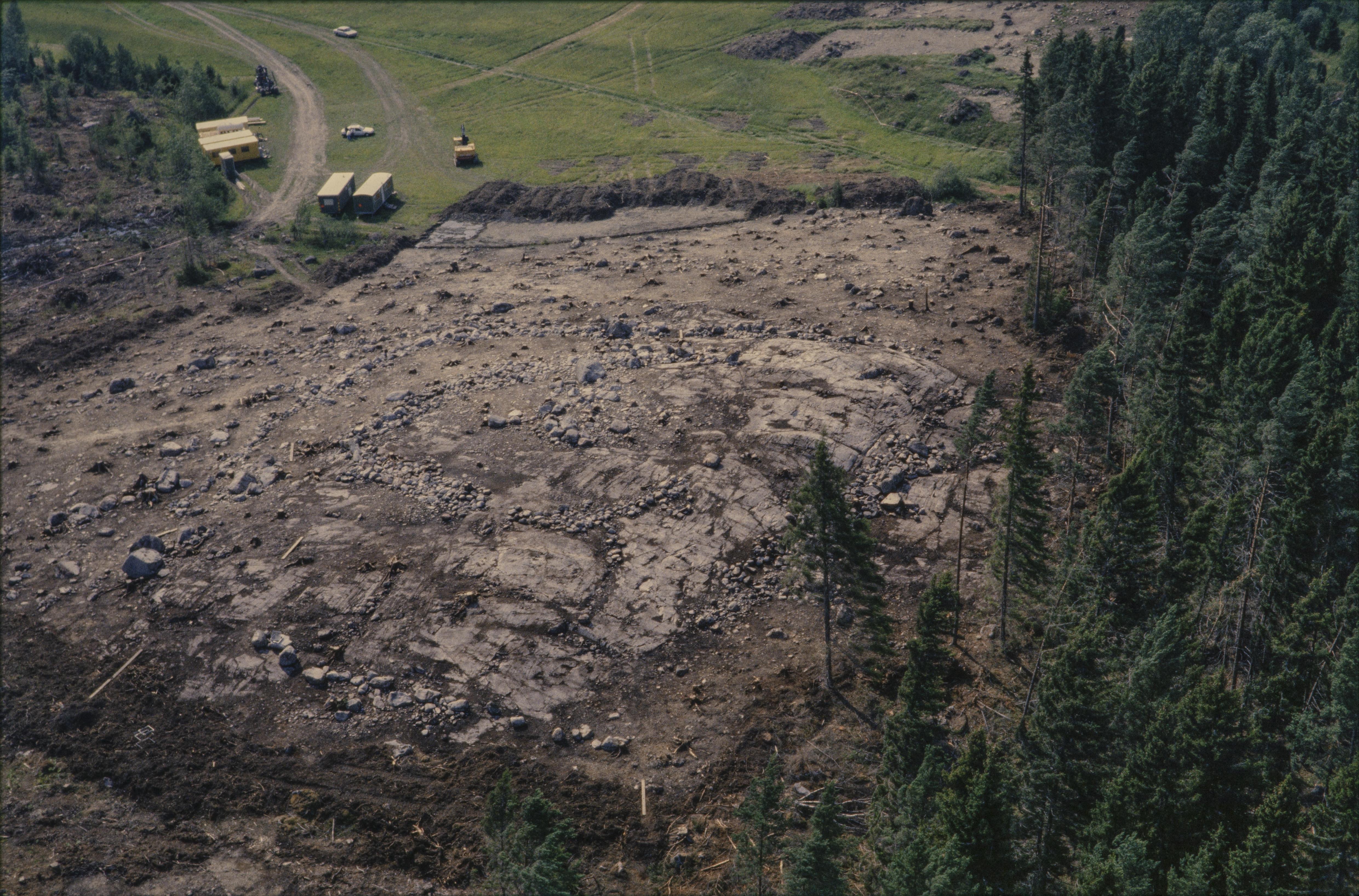 Beskrivning: Arkeologisk undersökning innan bygge av järnväg (Arlandabanan) i Rickebyåns dalgång i områden söder om Svartsjön. Fornborg Odensala 235:1, boplats Odensala 489:1, m.fl. Bilden är tagen mot (väderstreck): SSO