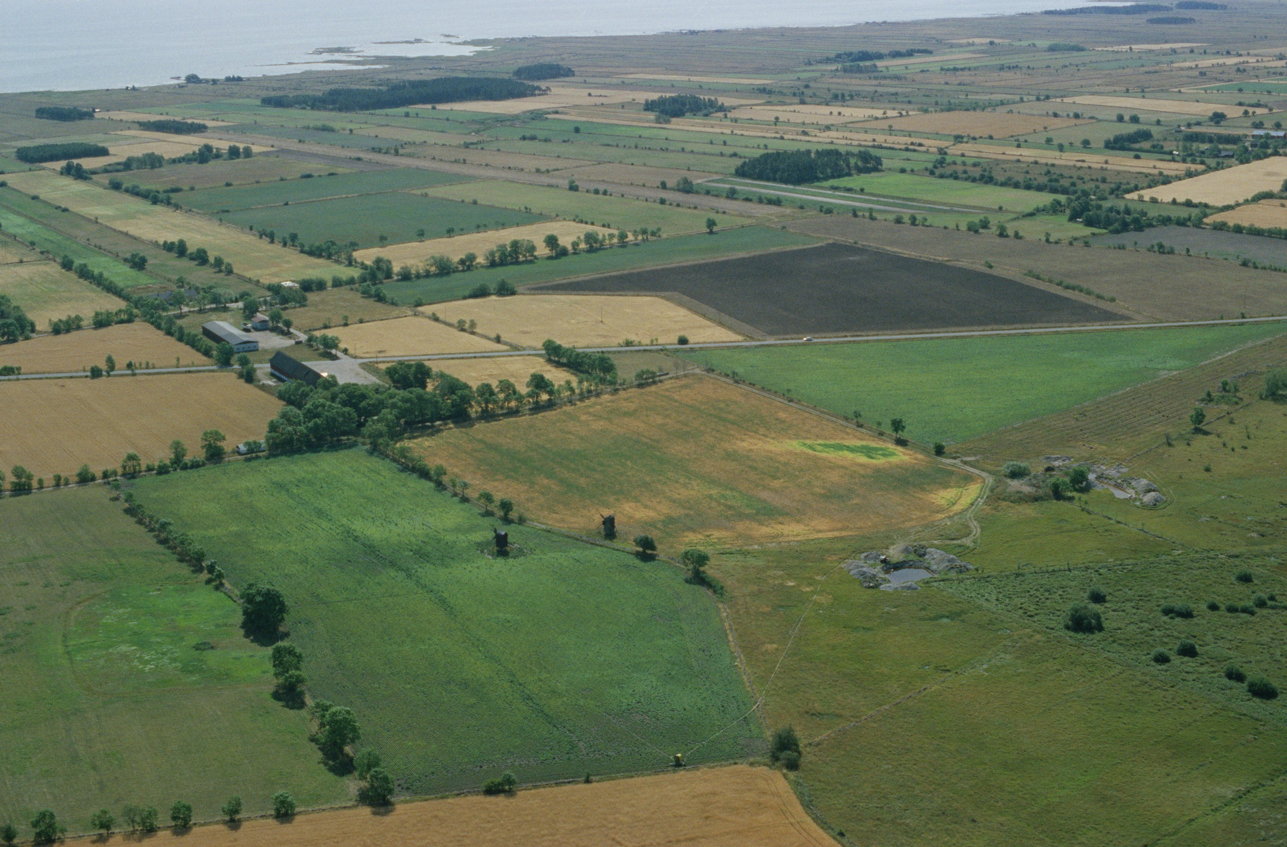 Beskrivning: Mörby by vid gränsen mellan socken Löt (till vänster) och Egby (uppe till höger). Fyndplats (järndolk) RAÄnr Löt 115:1 i åker under bildens mitt. Bilden är tagen mot (väderstreck): SO