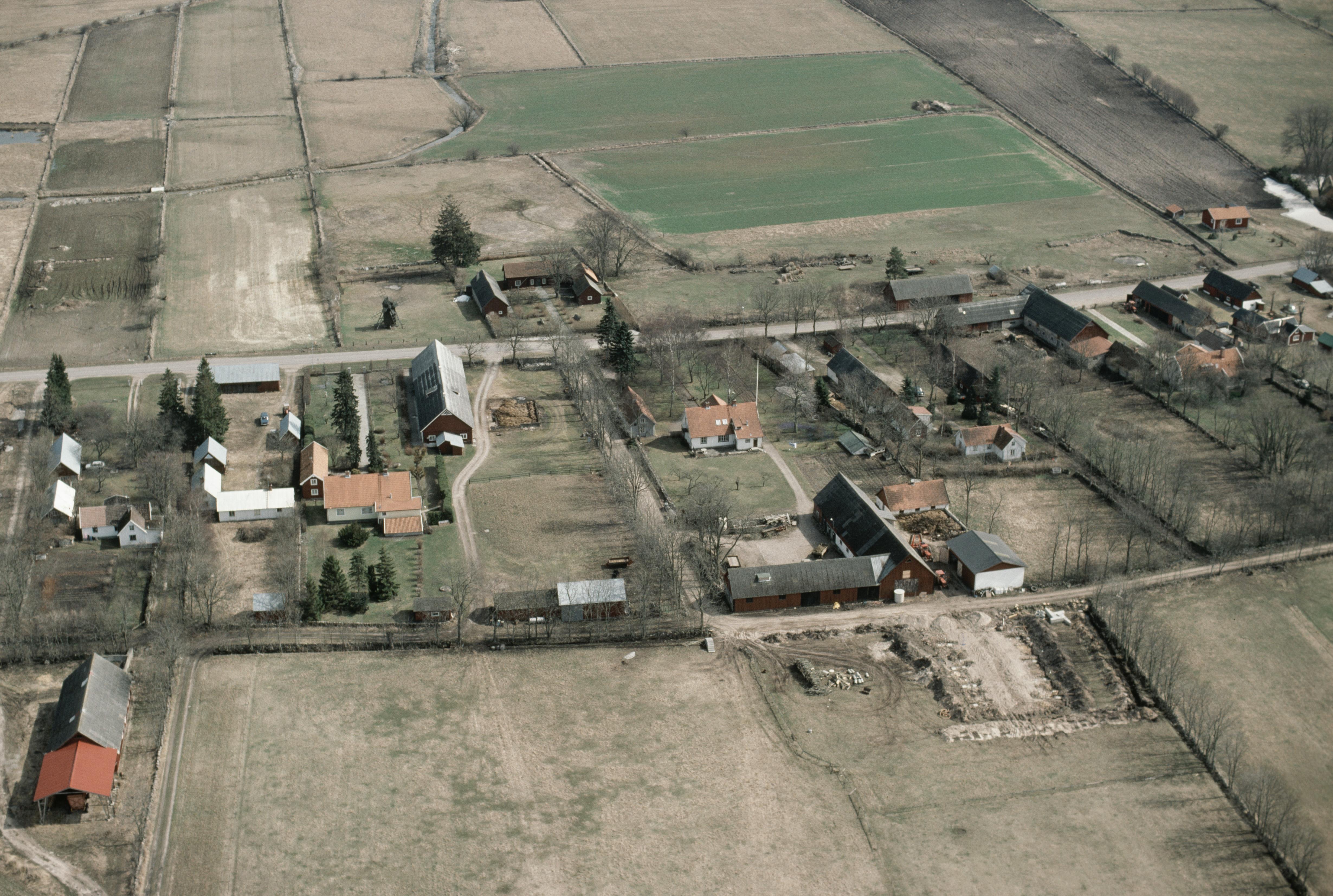 Beskrivning: Bjärby. Till vänster under bildens mitt lämningar efter ett kapell (helgat åt S:ta Margareta) RAÄnr Runsten 160:1. Bilden är tagen mot (väderstreck): OSO