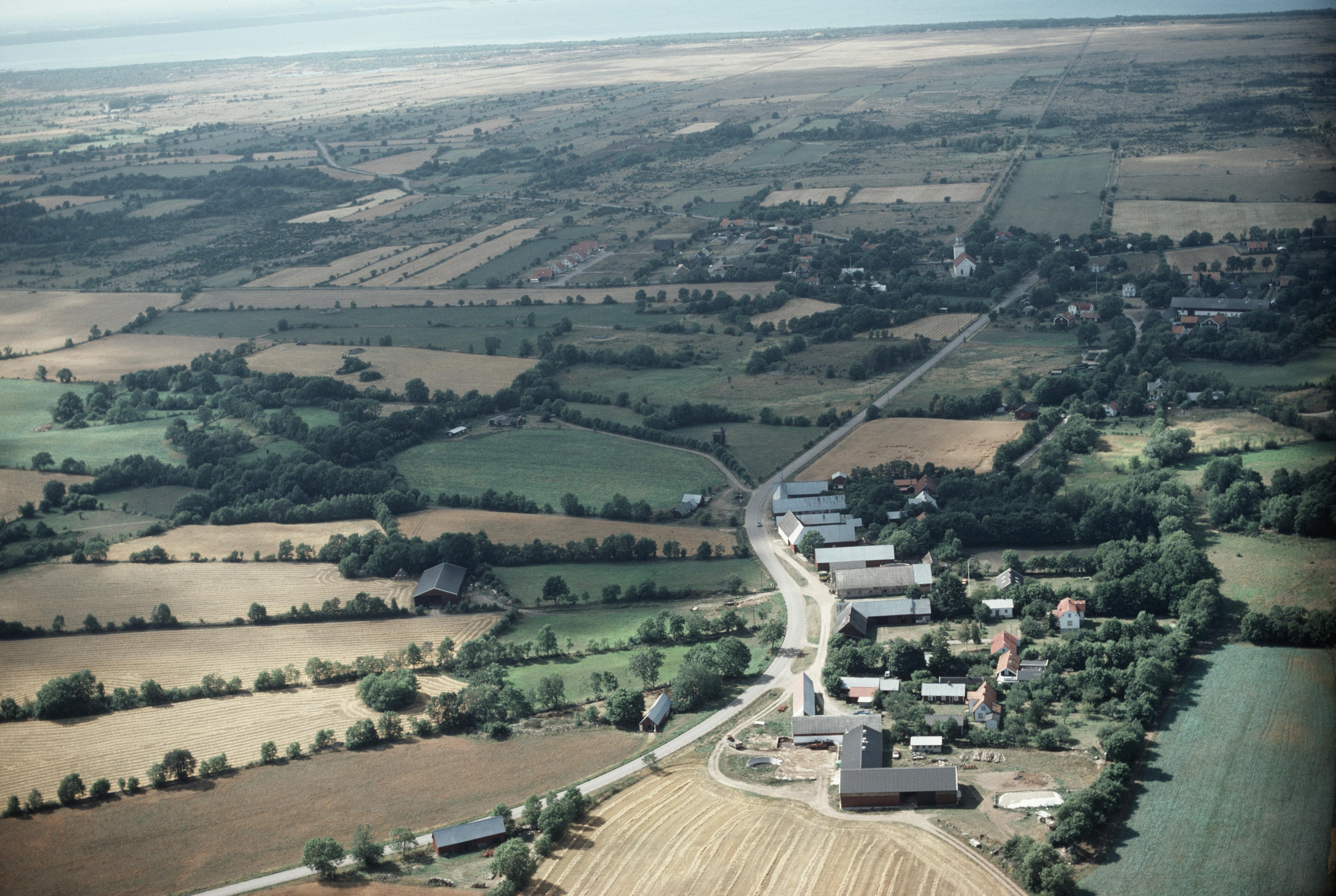 Beskrivning: Äpplerums by. Räpplinge kyrka uppe till höger. Bilden är tagen mot (väderstreck): V