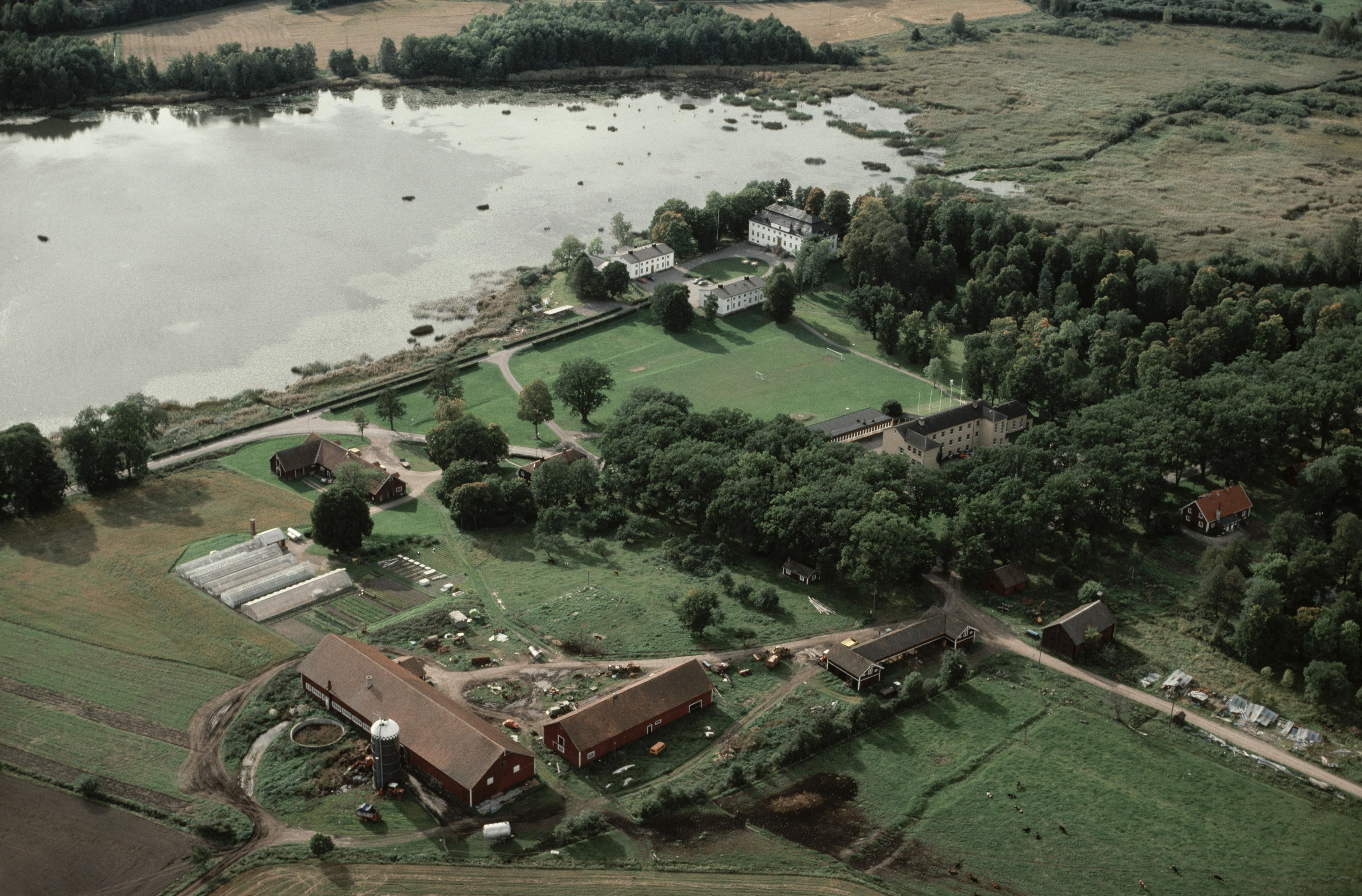 Beskrivning: Ekebyholms slott vid sjön Syningen. Vid slottet sädesmagasin RAÄnr Rimbo 248:1-2. Bilden är tagen mot (väderstreck): NV