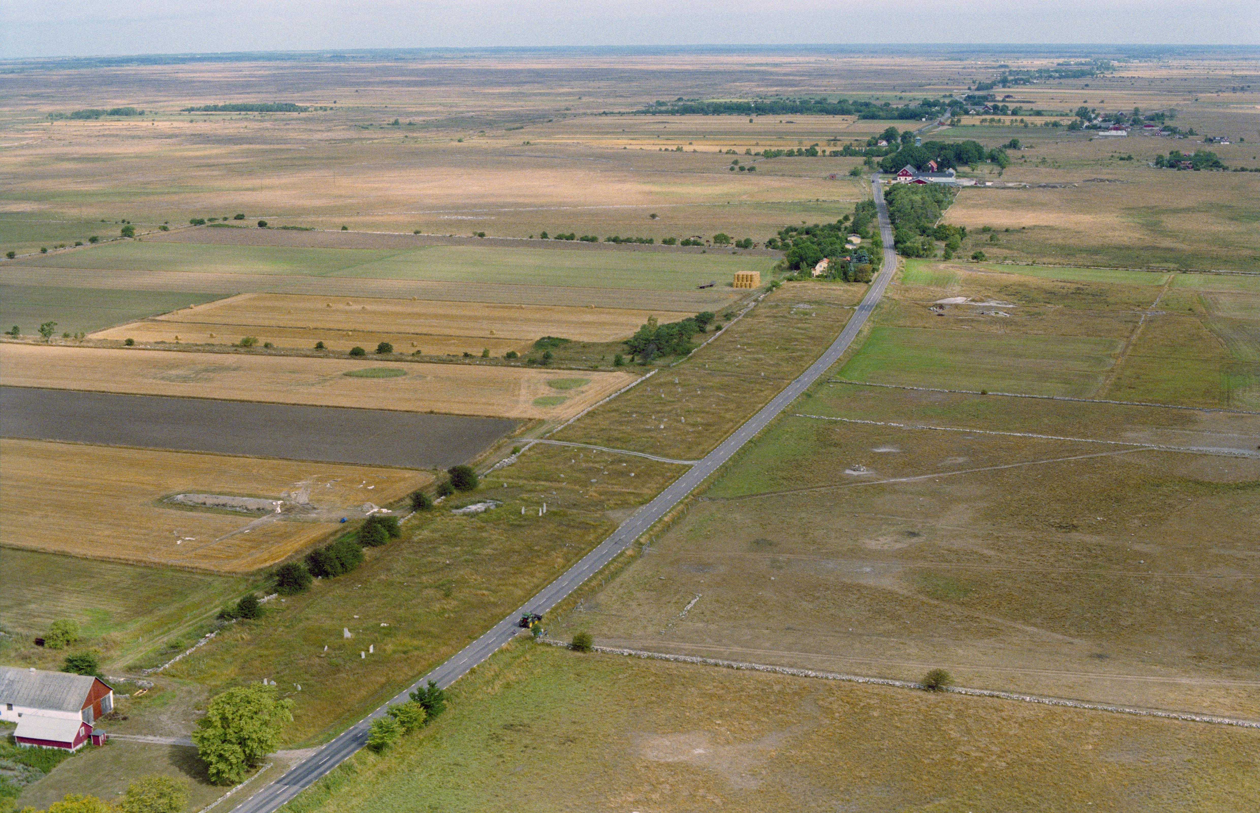 Beskrivning: Alvaret, södra delen. Gravfält RAÄ Segerstad 24:1 till vänster vid bildens mitt. Bilden är tagen mot (väderstreck): NNV