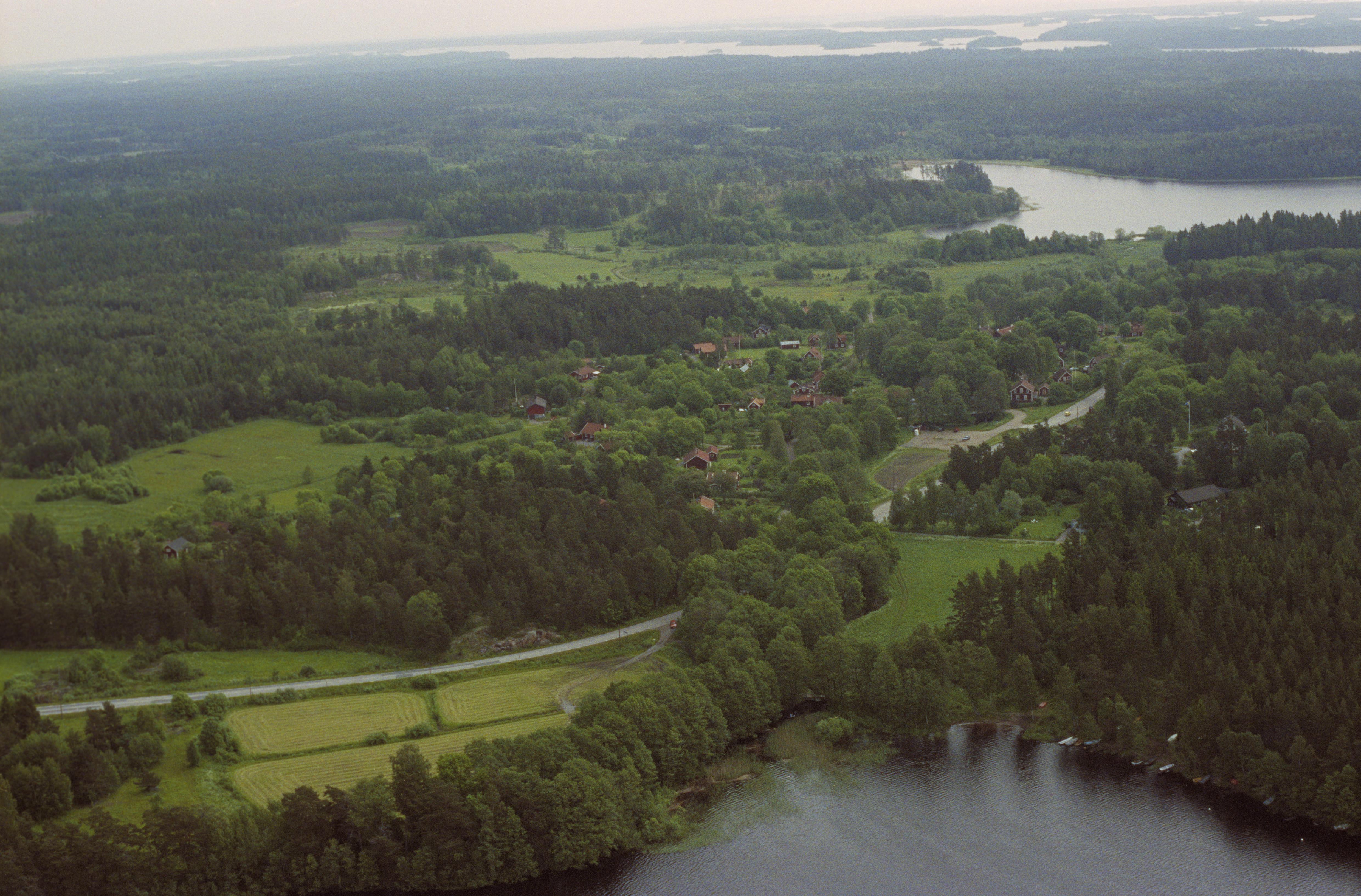 Beskrivning: Vira bruk RAÄnr Roslags-Kulla 7:1 vid Viraån. Nere till höger sjön Viren, uppe till höger Losjön. I bildens övre kant Roslagens skärgård mot Ljusterö socken. Bilden är tagen mot (väderstreck): Ö