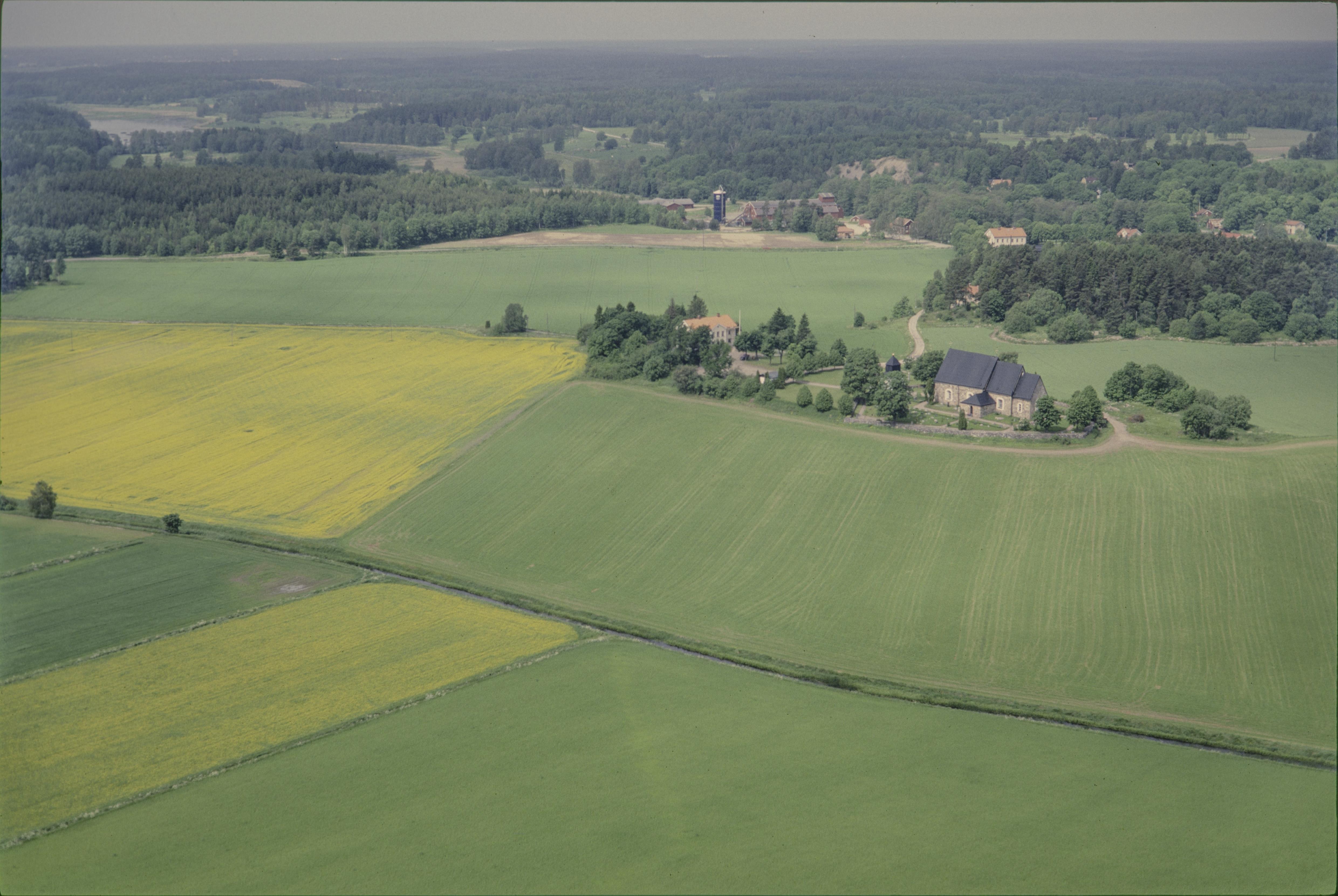 Beskrivning: Skederids kyrka till höger om bildens mitt. Uppe till höger Finsta herrgård i Finsta by, Husbyån, Brunkebergsbacken och Heliga Birgittas källa RAÄnr Skederid 73:1. Bilden är tagen mot (väderstreck): NNV