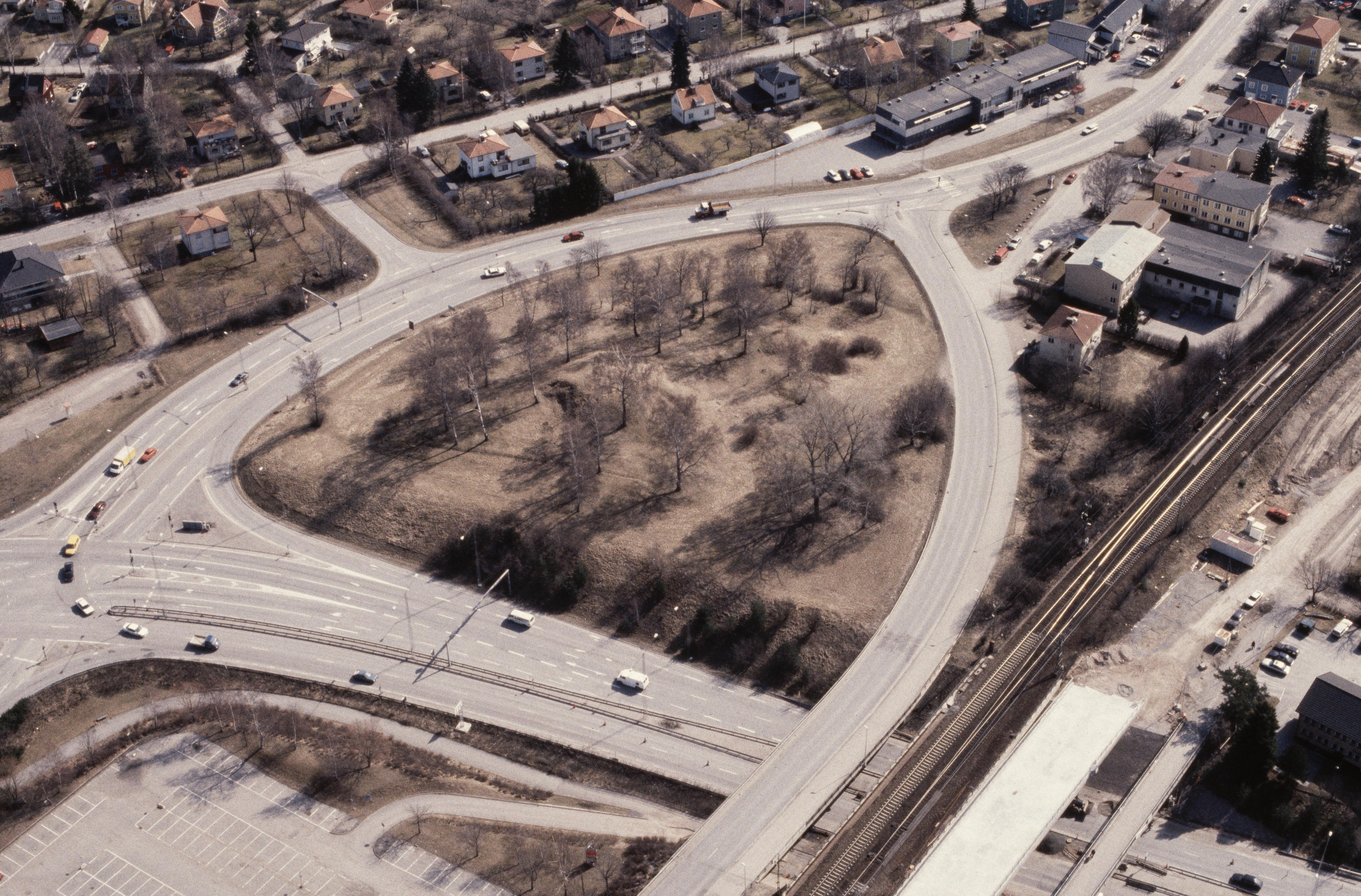 Beskrivning: Gravfältet Kungshögen RAÄnr Sollentuna 28:1 omgiven av vägar i ett område med tät trafik vid Sollentuna centrum. Bilden är tagen mot (väderstreck): SO