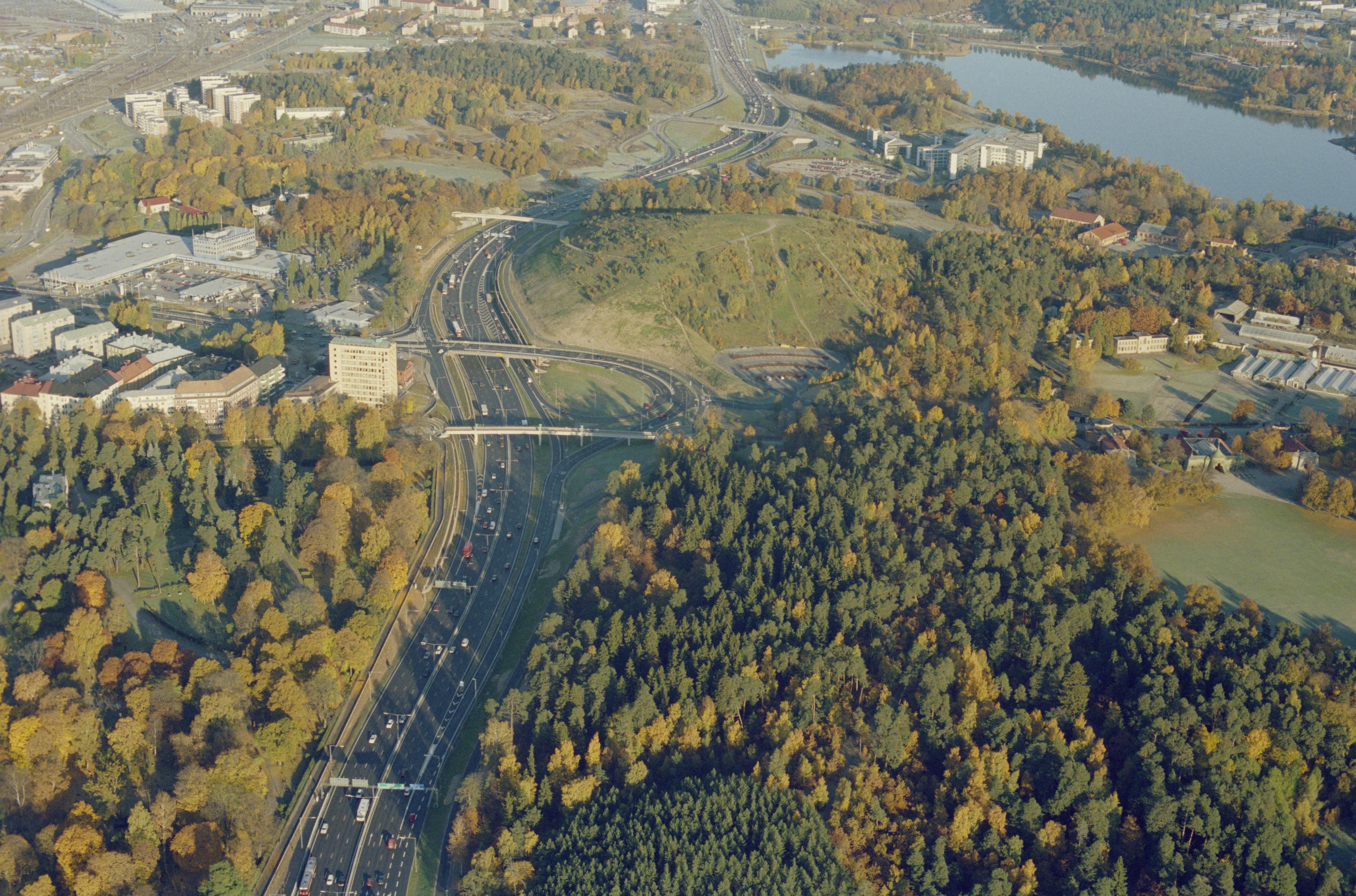 Beskrivning: Väg E4 mellan Hagaparken och Norra begravningsplatsen. Hagahuset, Hagakullen med röse RAÄnr Solna 37:1 och Brunnsviken. Bilden är tagen mot (väderstreck): NV