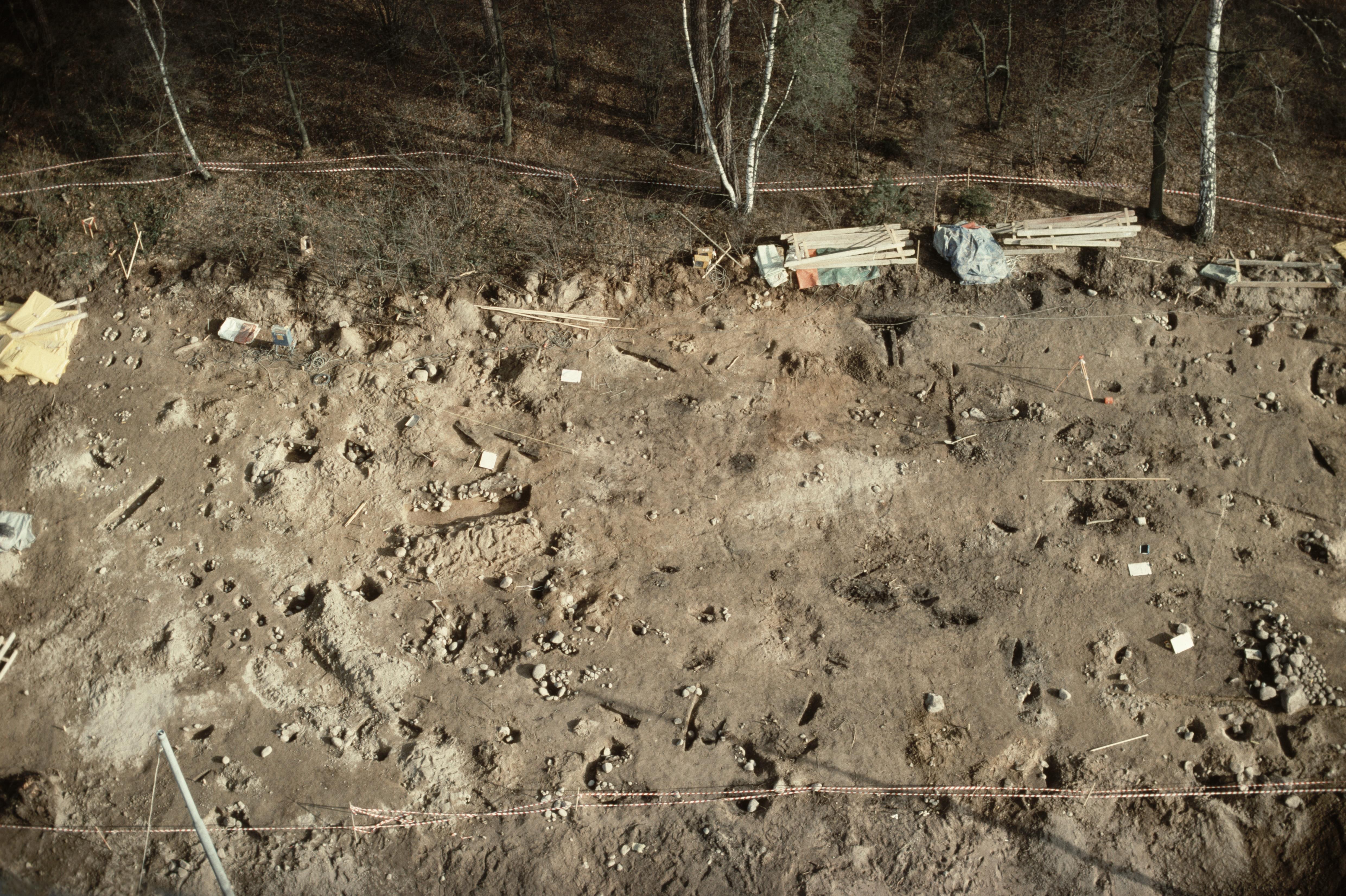 Beskrivning: Arkeologisk undersökning vid väg E4 mellan Norra begravningsplatsen och Hagaparken. Boplats RAÄnr Solna 85:1. Bilden är tagen mot (väderstreck): ONO