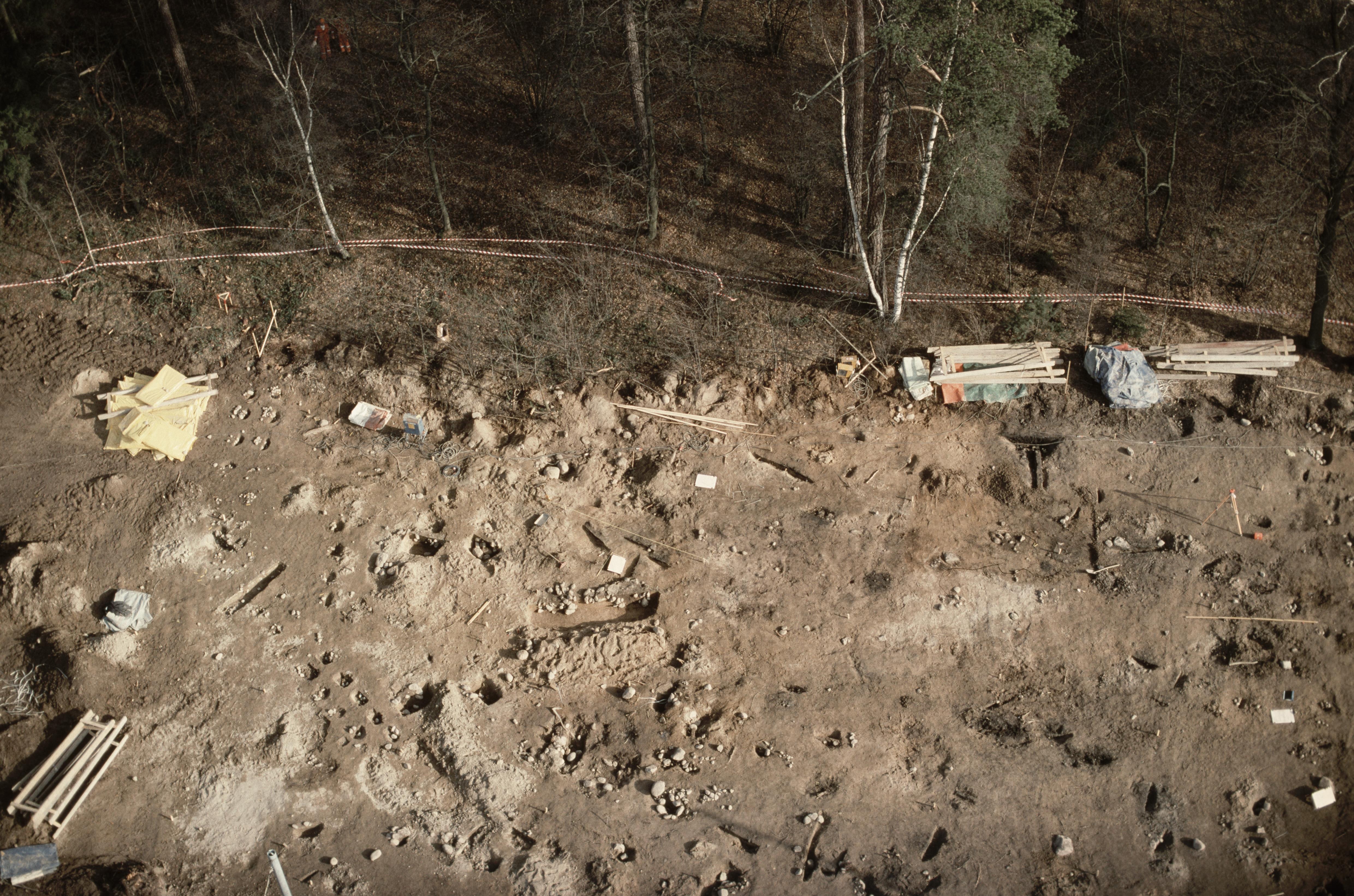 Beskrivning: Arkeologisk undersökning vid väg E4 mellan Norra begravningsplatsen och Hagaparken. Boplats RAÄnr Solna 85:1. Bilden är tagen mot (väderstreck): ONO
