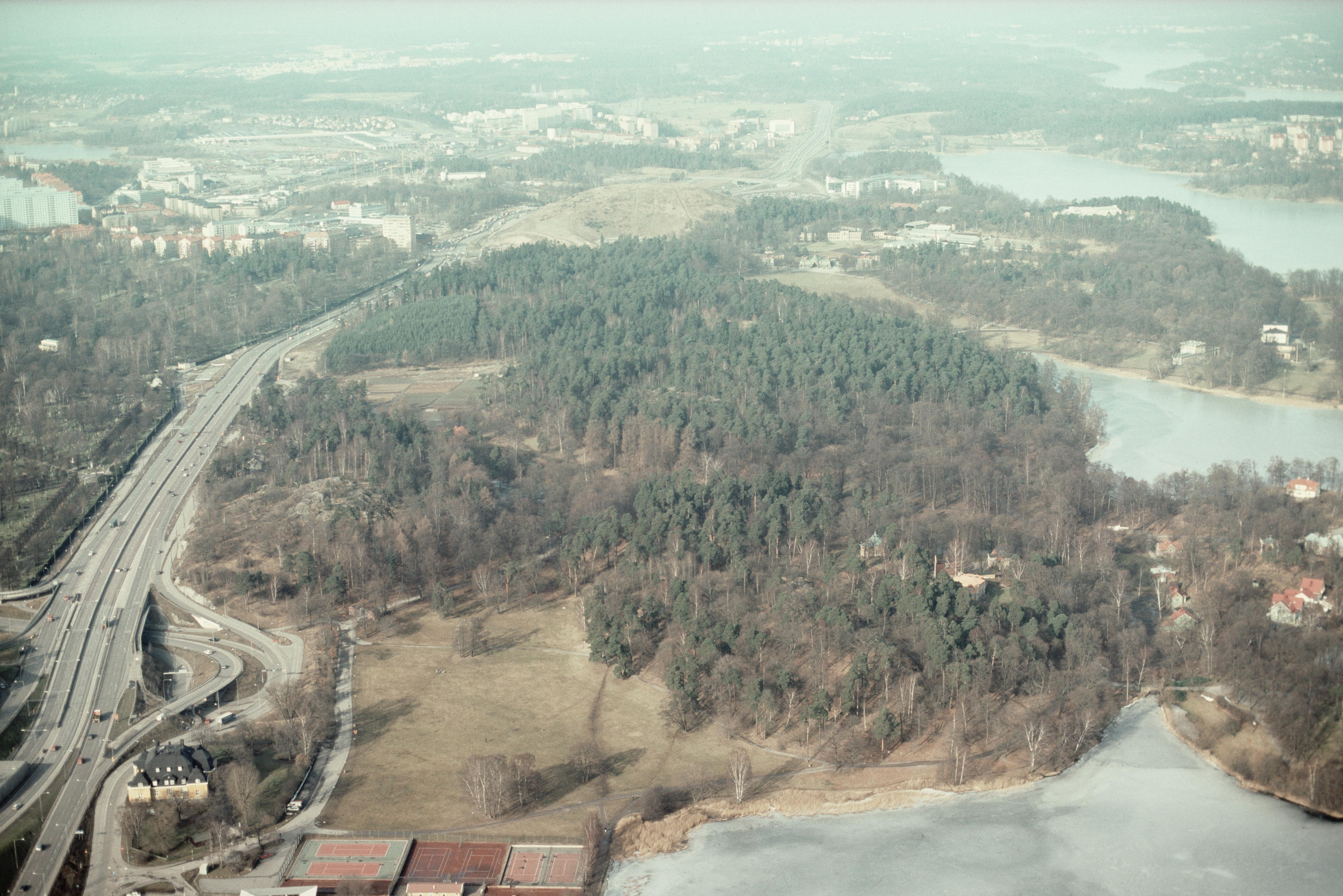 Beskrivning: Gamla Haga i Hagaparken vid Brunnsviken. Haga Tingshus nere till vänster. Till höger villorna Japan, Kina, Kinesiska paviljongen, Valhalla, Ädelsten m.fl. I bildens övre del Haga slott RAÄnr Solna 30:1. Bilden är tagen mot (väderstreck): NV