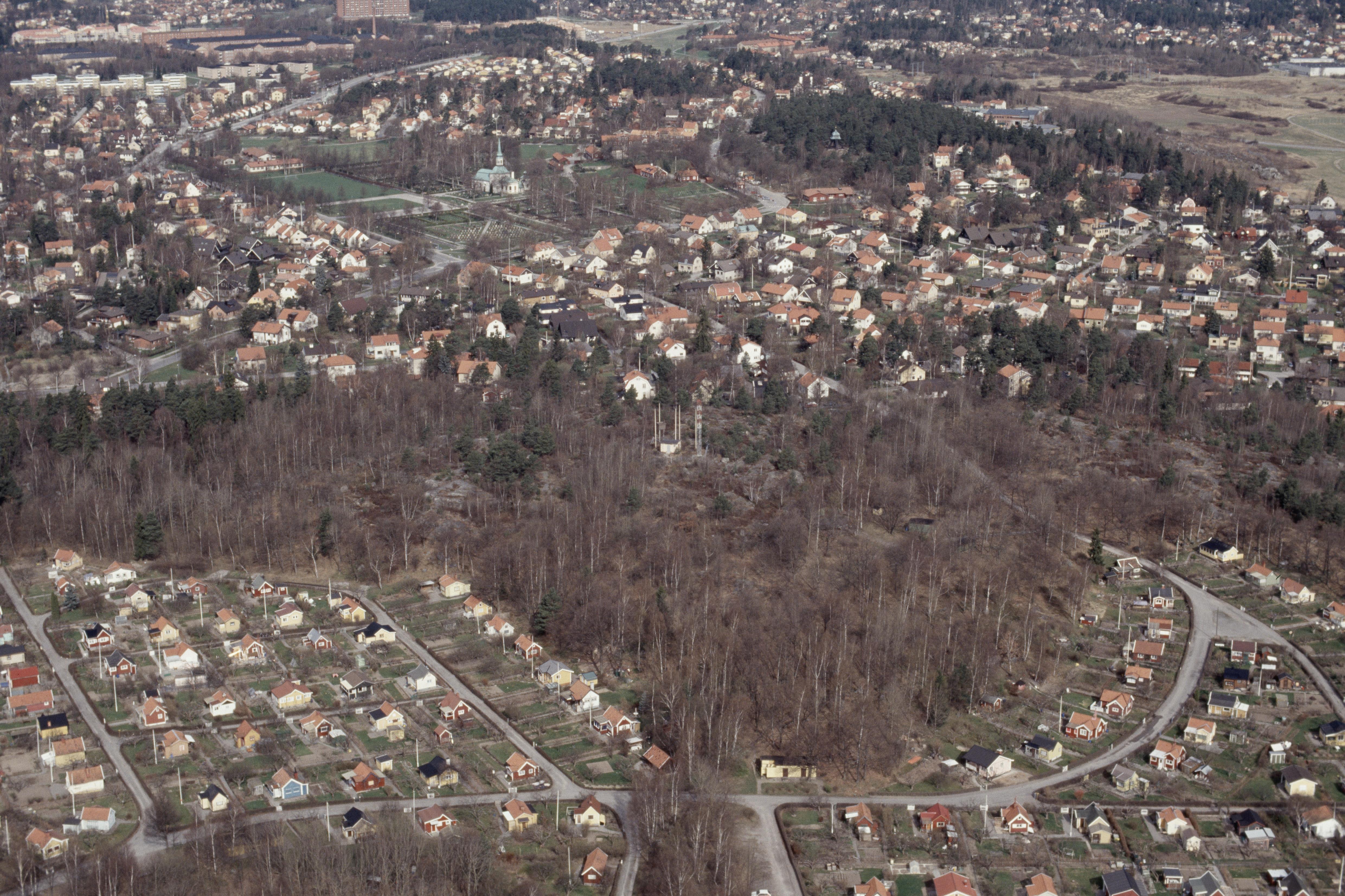 Beskrivning: Stadsdelen Bromma i Stockholms Västerort. Kortenslund i bildens nedre del. Till vänster över bildens mitt Bromma kyrka med medeltida kyrkotomt RAÄnr Stockholm 992. Bilden är tagen mot (väderstreck): NV