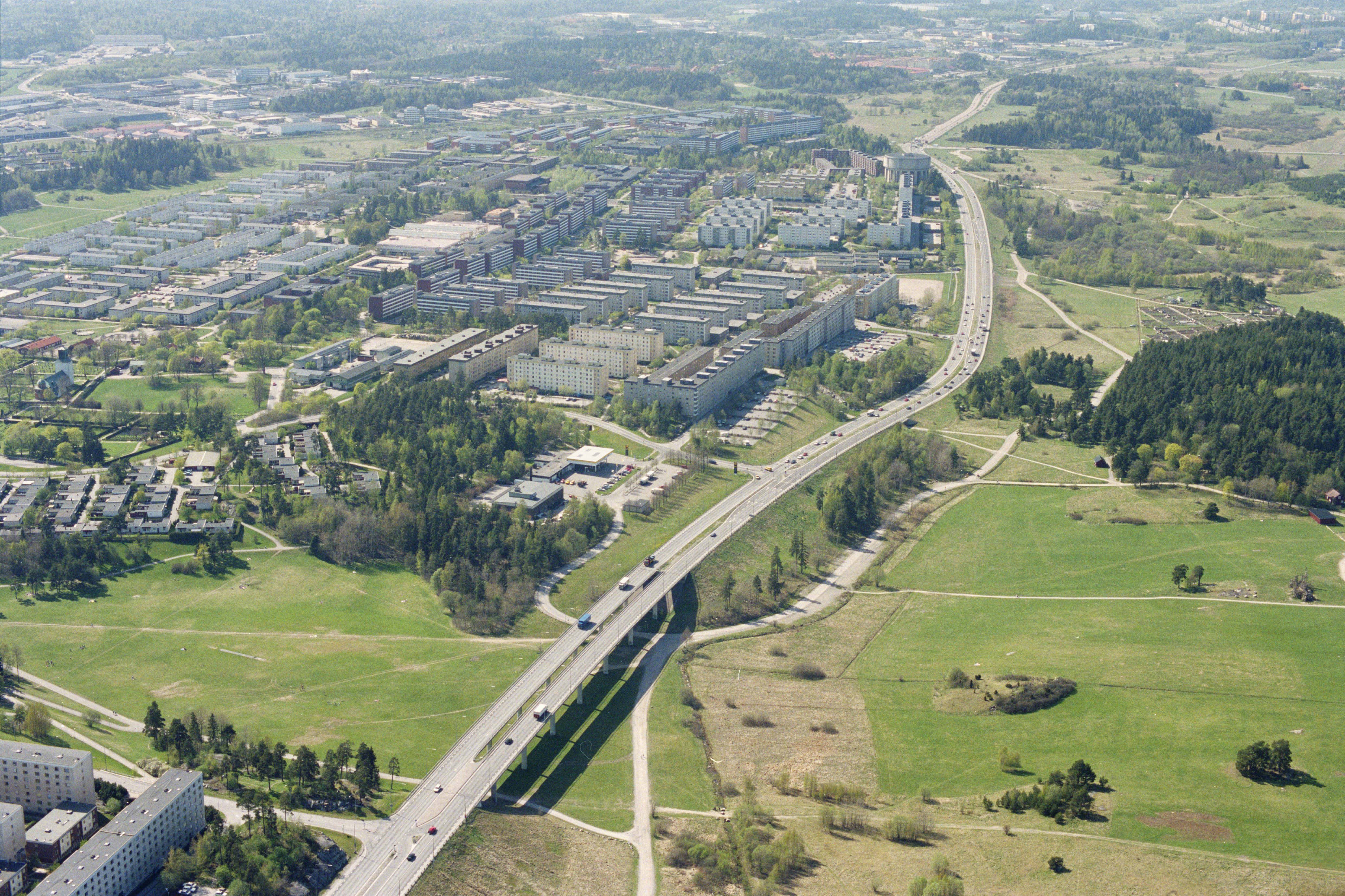 Beskrivning: (Tid. Spånga socken). Viadukt på väg E18 mellan Rinkeby - Spånga - Tensta. Spånga kyrka till vänster. Till höger Eggeby med gravfält Tallbacken RAÄnr Spånga 86:1. Bilden är tagen mot (väderstreck): V