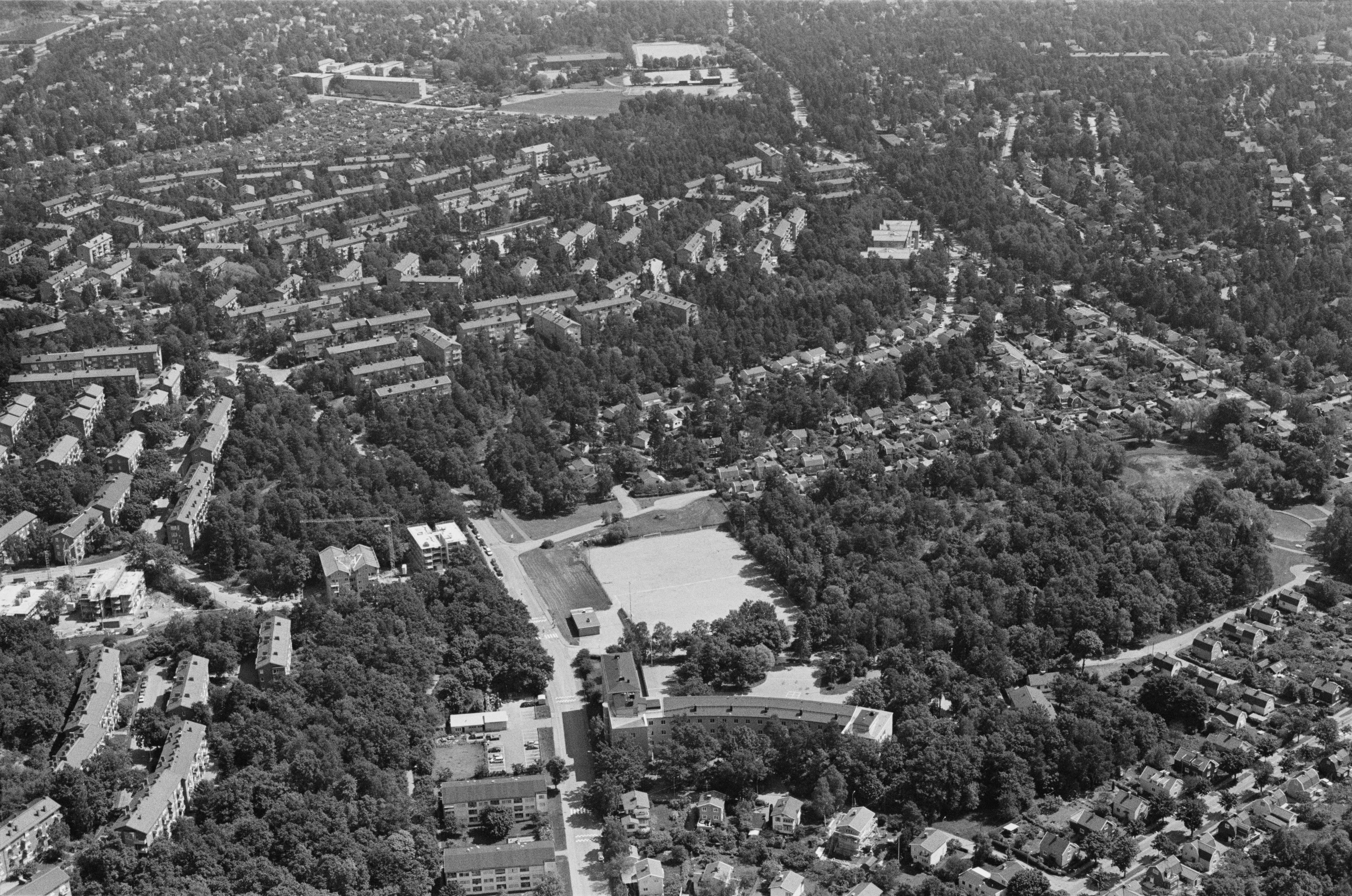 Beskrivning: Området Olovslund i stadsdelen Bromma i Stockholms Västerort. Till höger om bildens mitt Olovslunden med stensättningar RAÄnr Bromma 10:1-2. Bilden är tagen mot (väderstreck): OSO