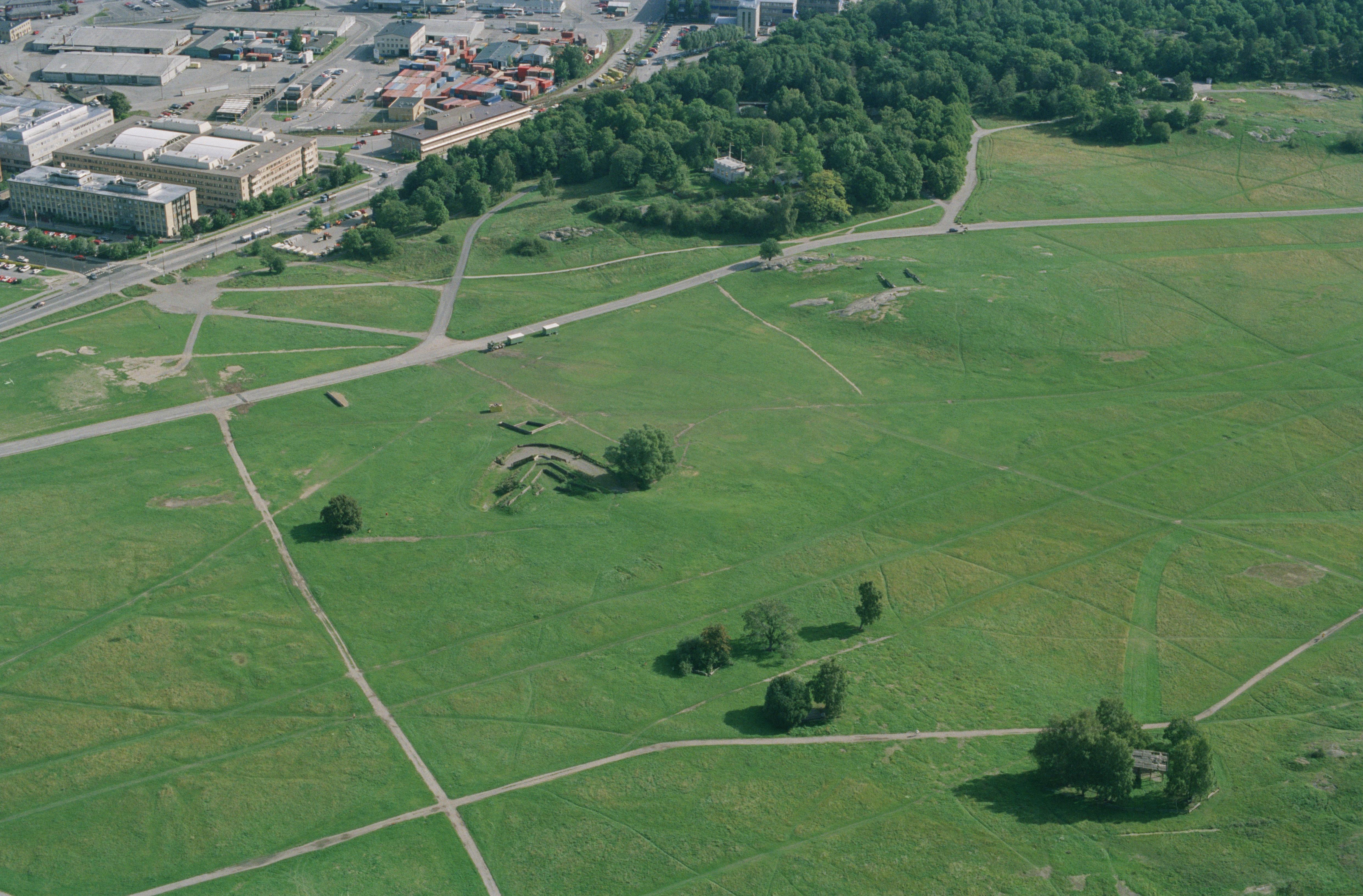 Beskrivning: Gärdet. Ladugårdsgärdet. Hästhoppningshinder i skans och husgrund RAÄnr Stockholm 104:1-2. Bilden är tagen mot (väderstreck): NO