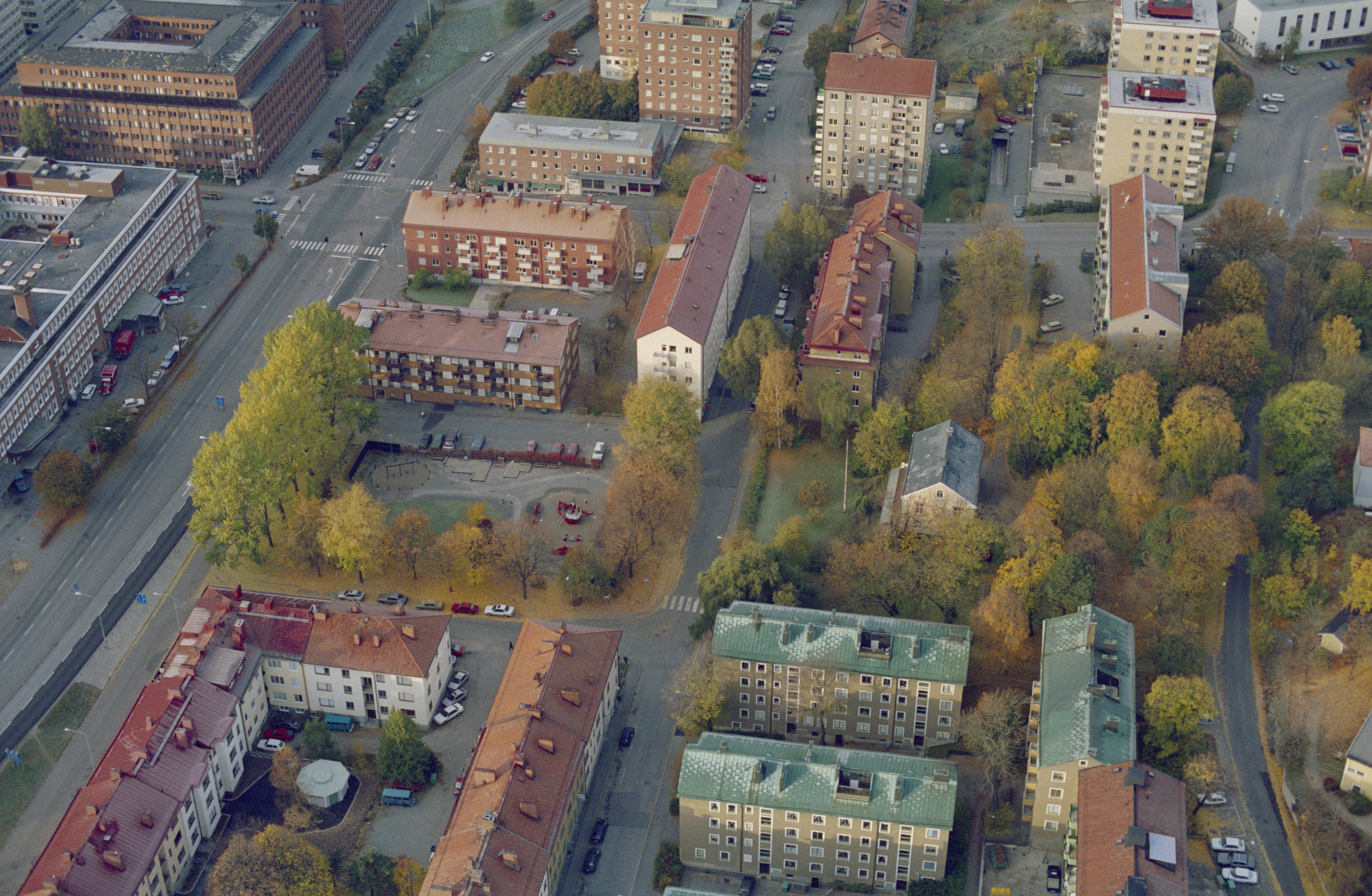 Beskrivning: Stamgårdsparken 3, Hamngatan, Tritonvägen och Trädgårdsgatan i området Lilla Alby i södra delen av Sundbyberg vid gränsen mot Solna socken (i bildens vänstra kant). Bilden är tagen mot (väderstreck): VSV