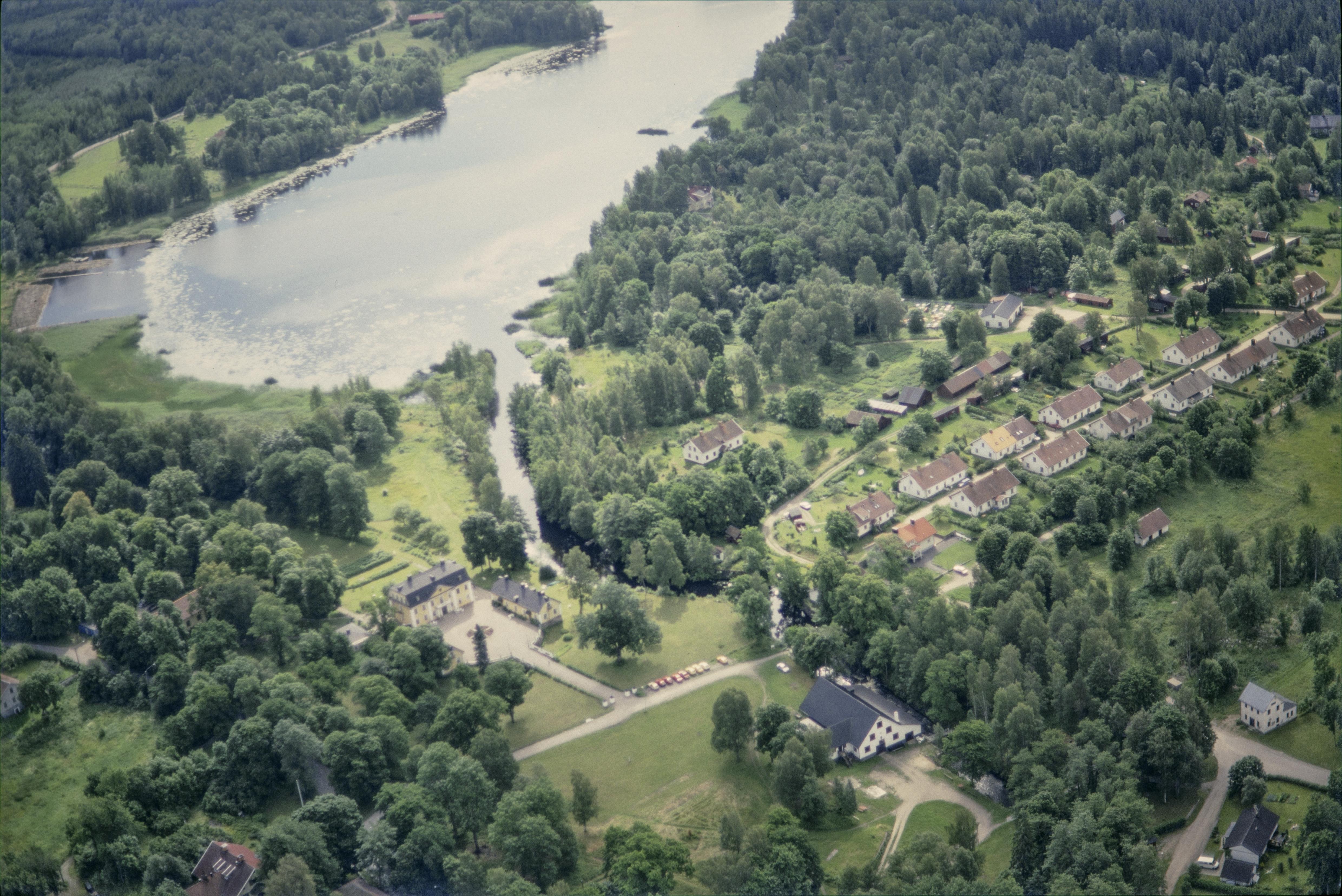 Beskrivning: Skebobruk RAÄnr Ununge 127:1 vid Skeboån och sjön Närdingen. Nere till vänster Skebobruks herrgård. Bilden är tagen mot (väderstreck): SO