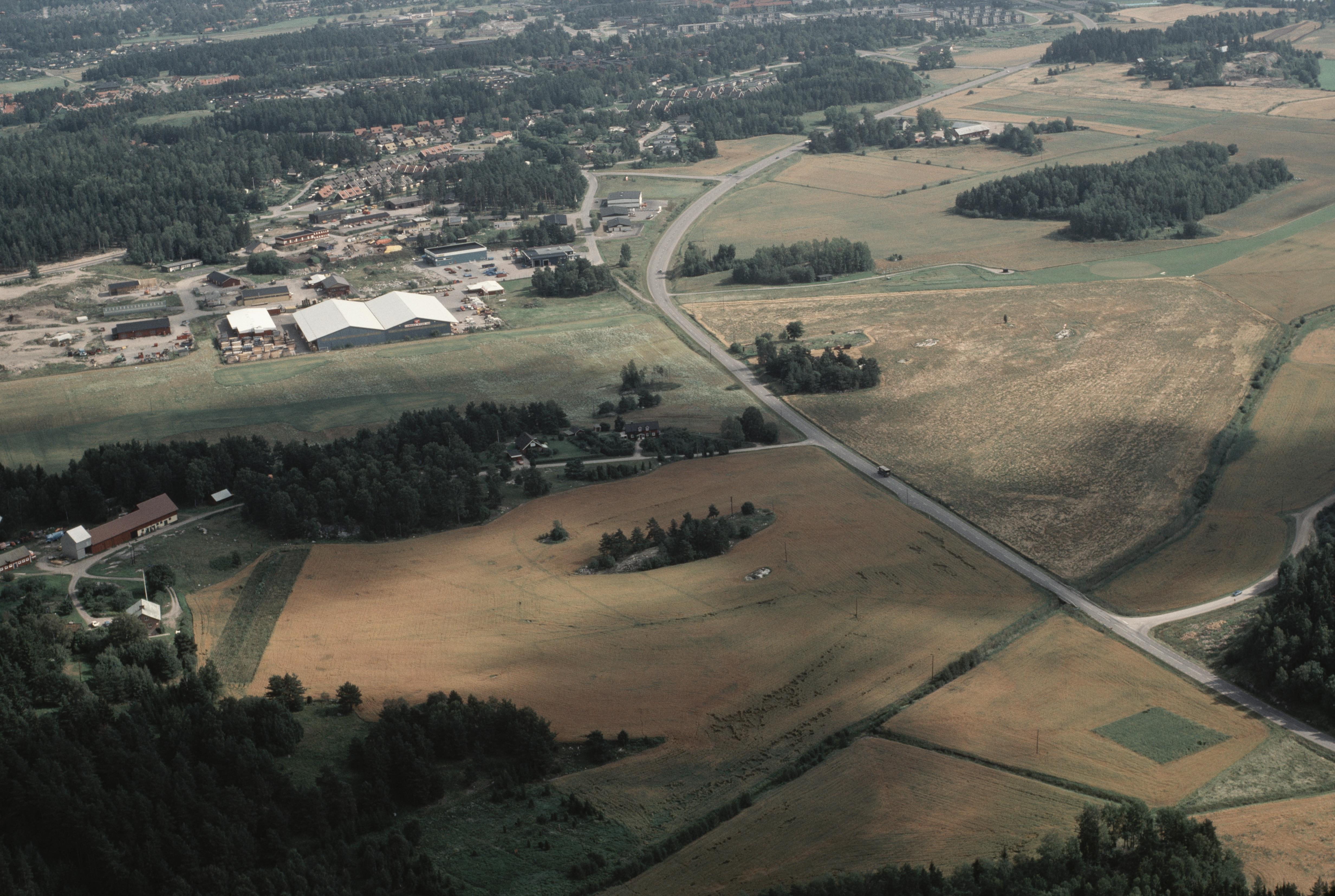 Beskrivning: Uppe till vänster Vallentuna flygfält. Nere till höger brolämning Gullbron och färdväg med runstenar RAÄnr Vallentuna 97:1 och 484:1 m.fl. Bilden är tagen mot (väderstreck): SO