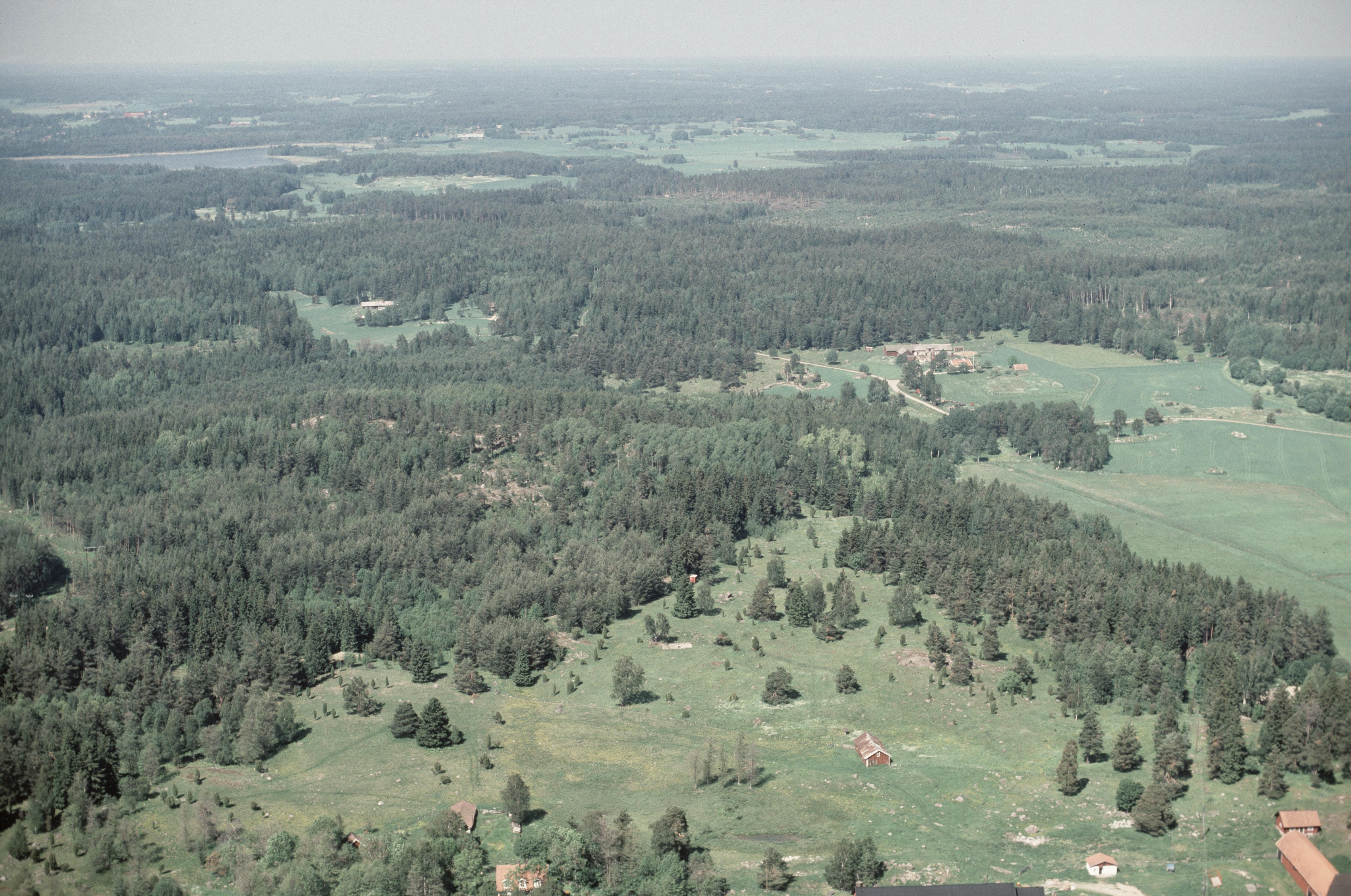 Beskrivning: Sydvästra delen av Angarnssjöängen, Långhundraleden. I bildens nedre del Lingsbergs by. I bildens övre del fornborg RAÄnr Vallentuna 265:1. Bilden är tagen mot (väderstreck): NNO
