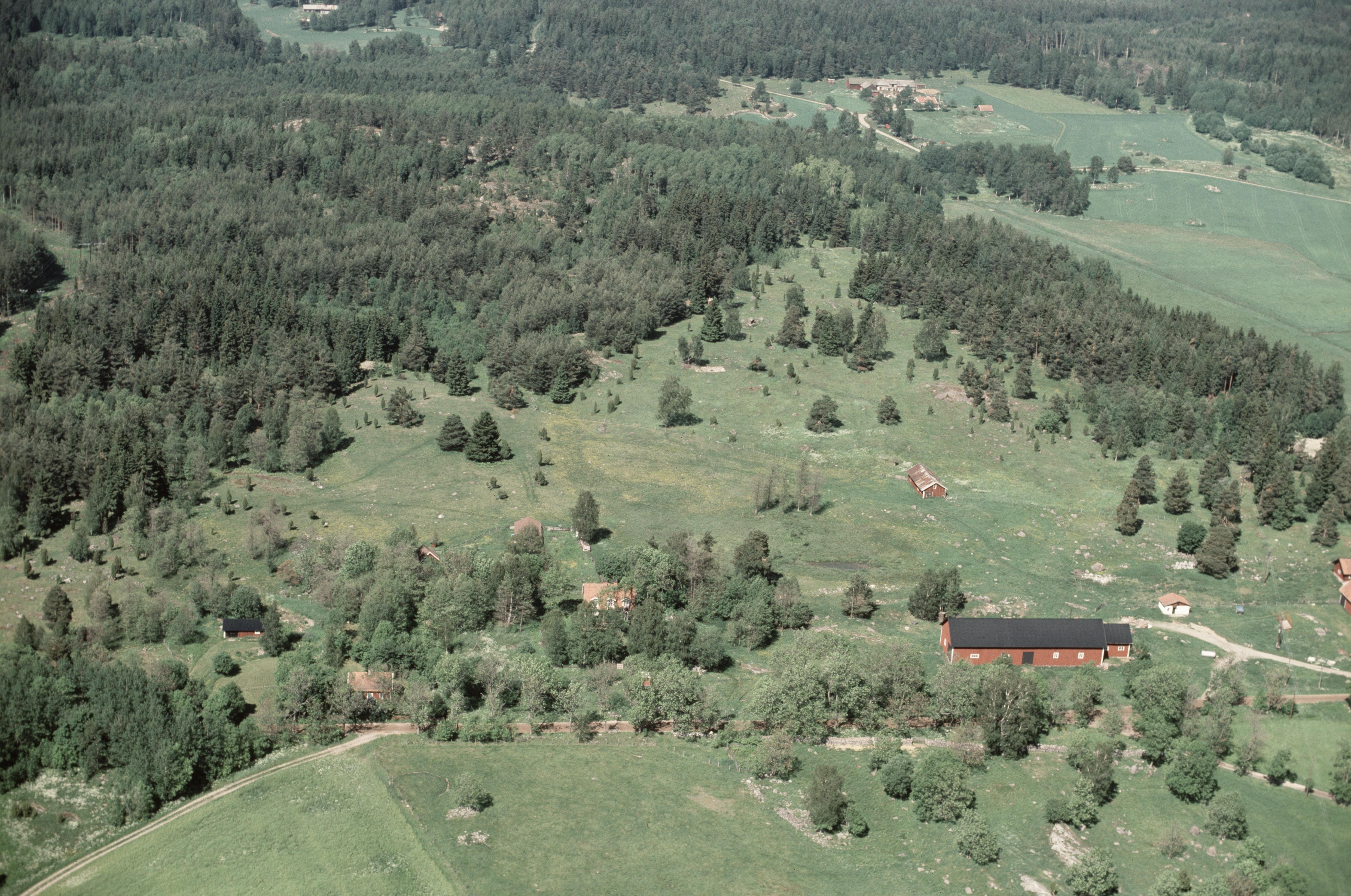 Beskrivning: Sydvästra delen av Angarnssjöängen, Långhundraleden. I bildens nedre del Lingsbergs by. I bildens övre del fornborg RAÄnr Vallentuna 265:1. Bilden är tagen mot (väderstreck): NNO
