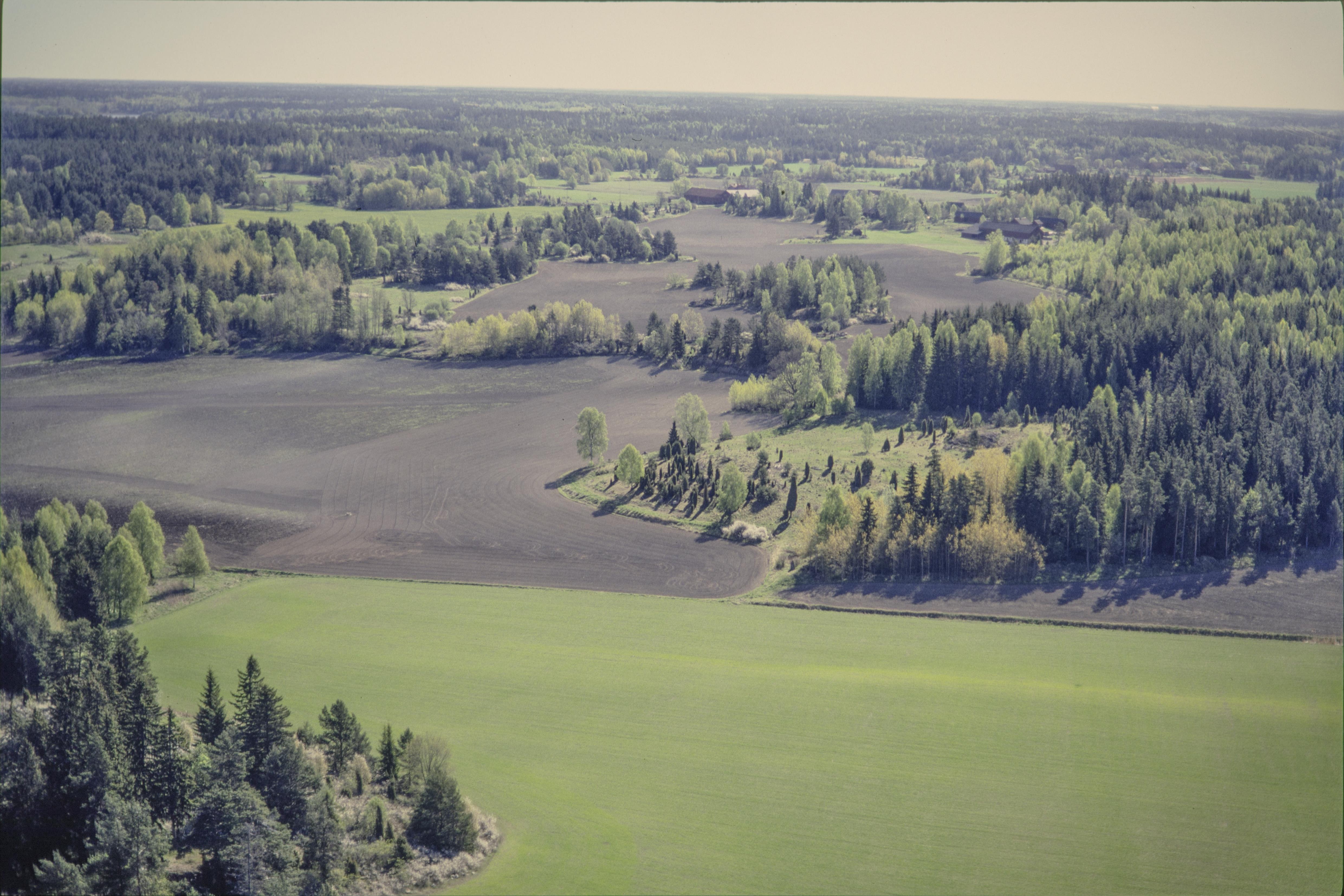 Beskrivning: Upplandsleden i området norr om Vickeby. Uppe till höger runsten och bro RAÄnr Knivsta 131:1-2. I bildens nedre del Vassunda socken. Bilden är tagen mot (väderstreck): Ö