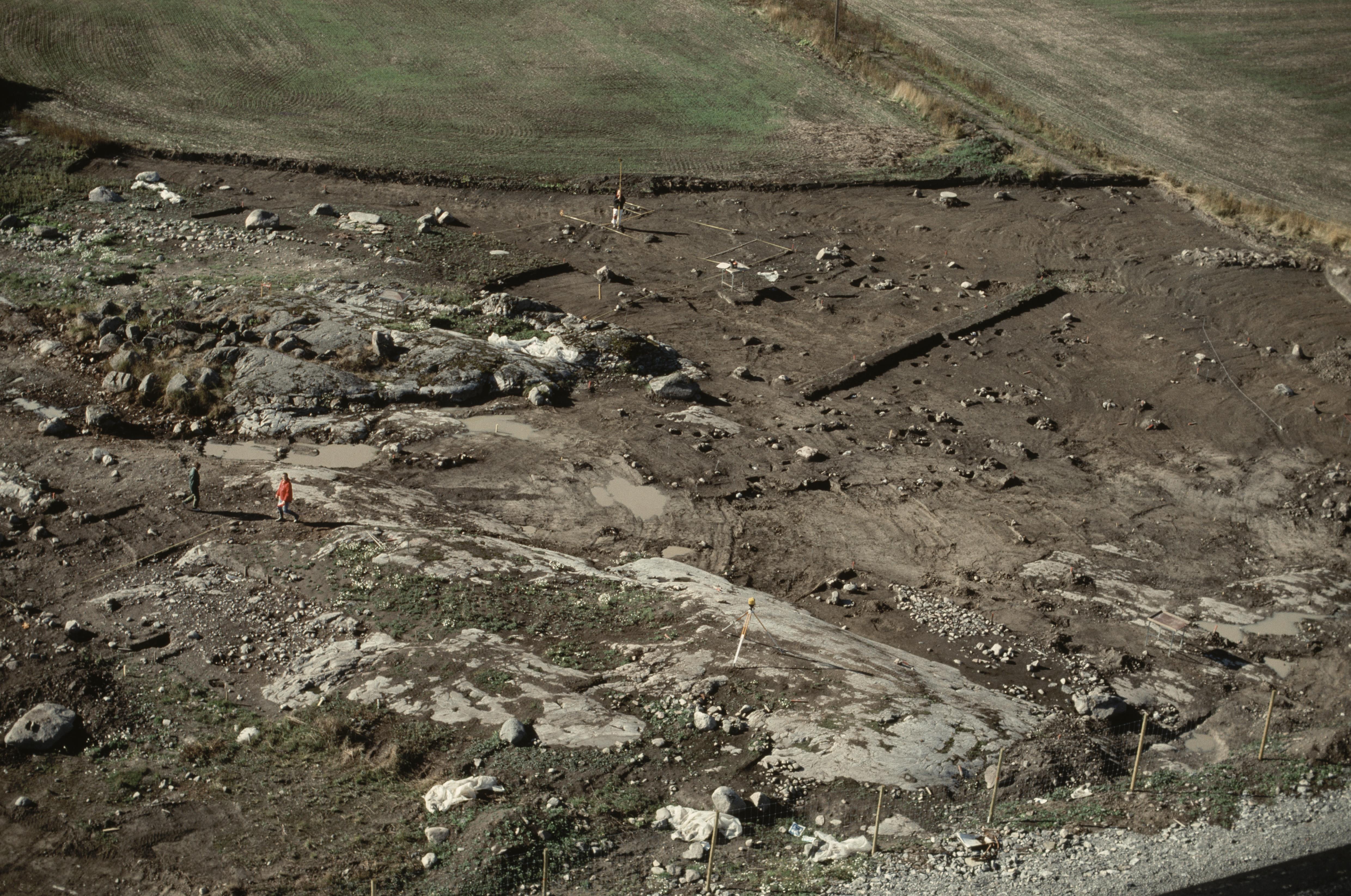 Beskrivning: Arkeologiska undersökningar innan bygge av väg E18 vid Apalle, Högsta och Pollista. I bilden västra delen av Pollista gamla tomt RAÄnr Övergran 228:1. Bilden är tagen mot (väderstreck): S