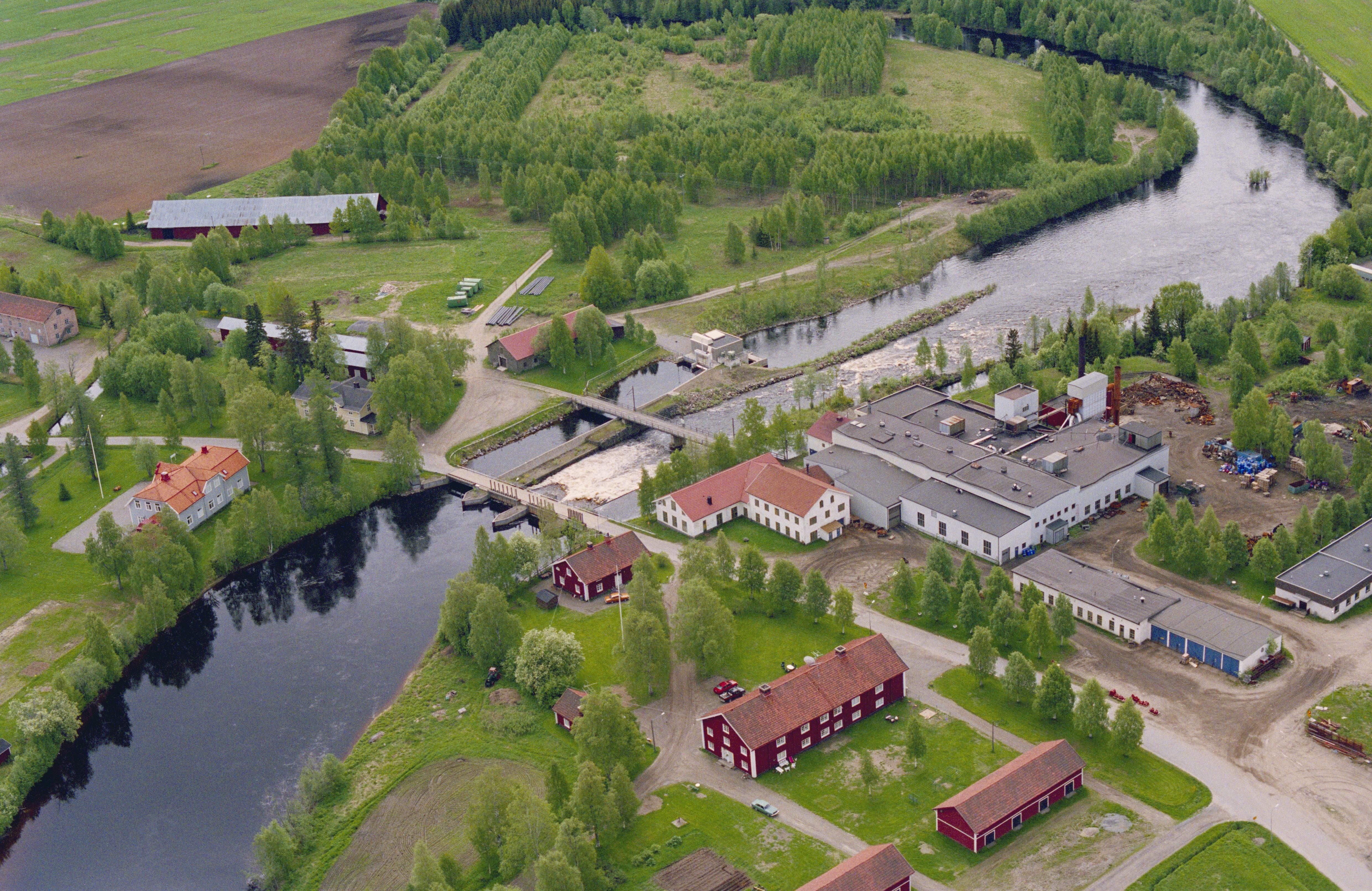 Beskrivning: Robertsfors bruk / järnbruk och tätort i Rickleåns dalgång. I bildens mitt hyttlämning RAÄnr Bygdeå 39:1 och hammarområde Bygdeå 40:1. Bilden är tagen mot (väderstreck): SSO