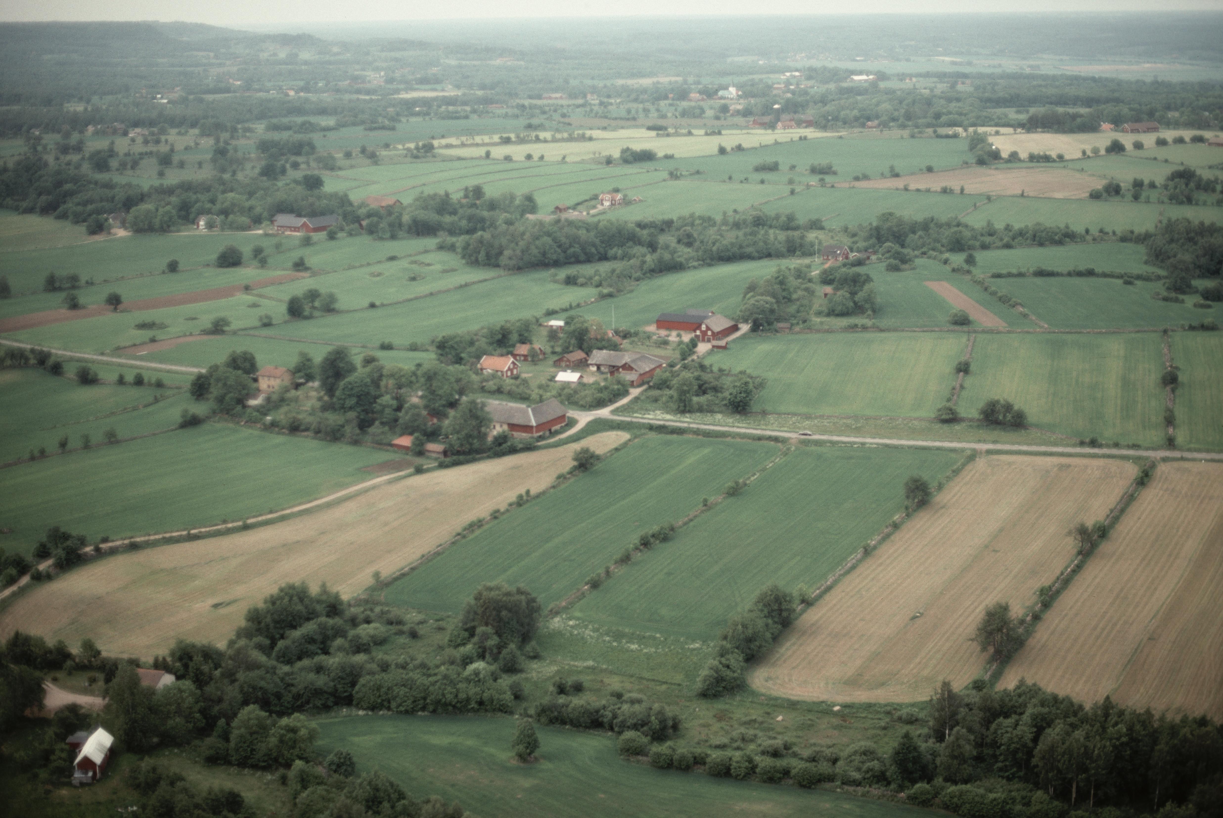 Beskrivning: Esbjörntorps gård och fossil åker RAÄnr Berg 131:1 och 132:1 m.fl. vid bildens mitt. I bildens övre del Bergs kyrka. Bilden är tagen mot (väderstreck): SV
