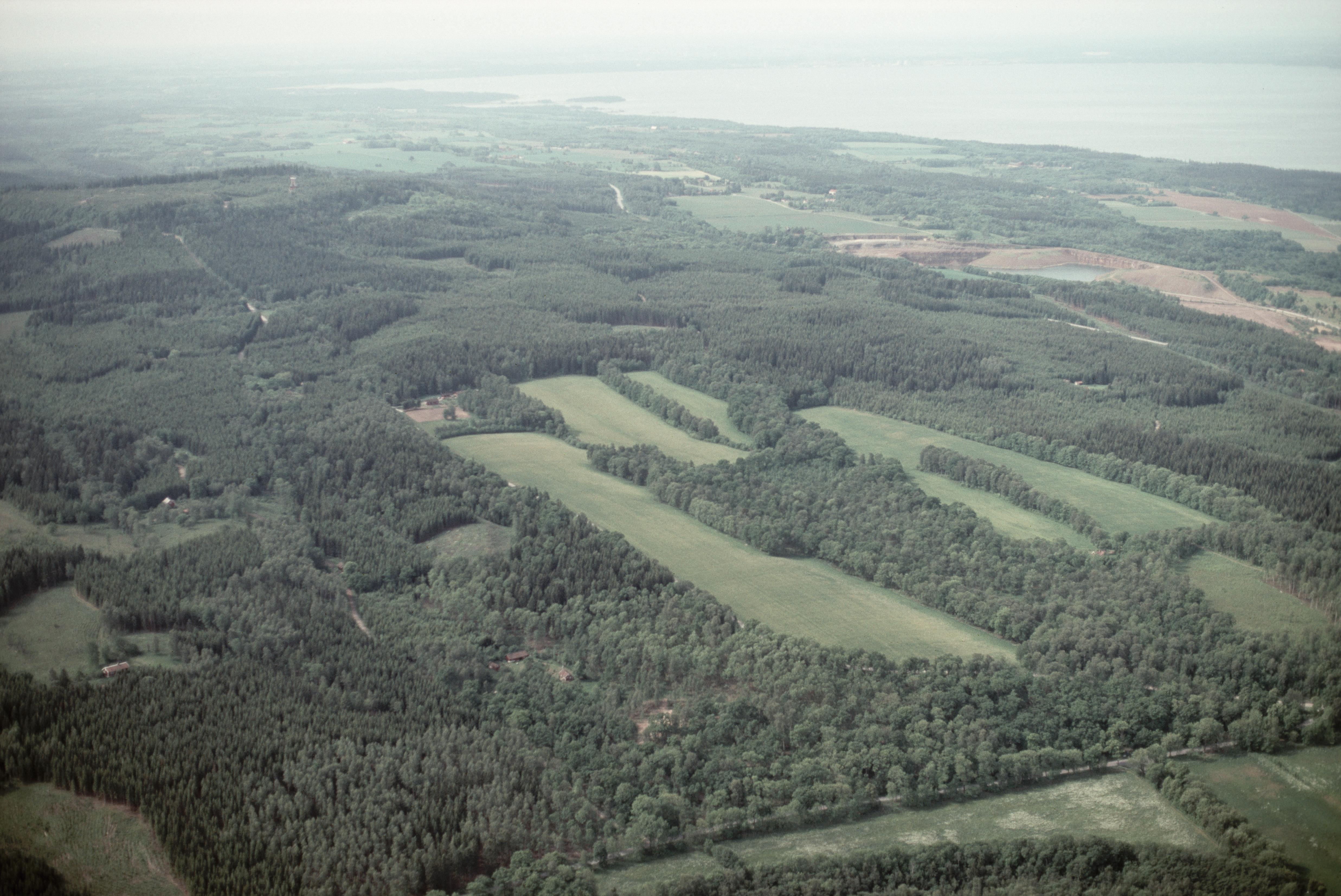 Beskrivning: Hästhagen i Hällekis vid bildens mitt. I bildens övre del Kinnekulle i Medelplana socken. Bilden är tagen mot (väderstreck): SV