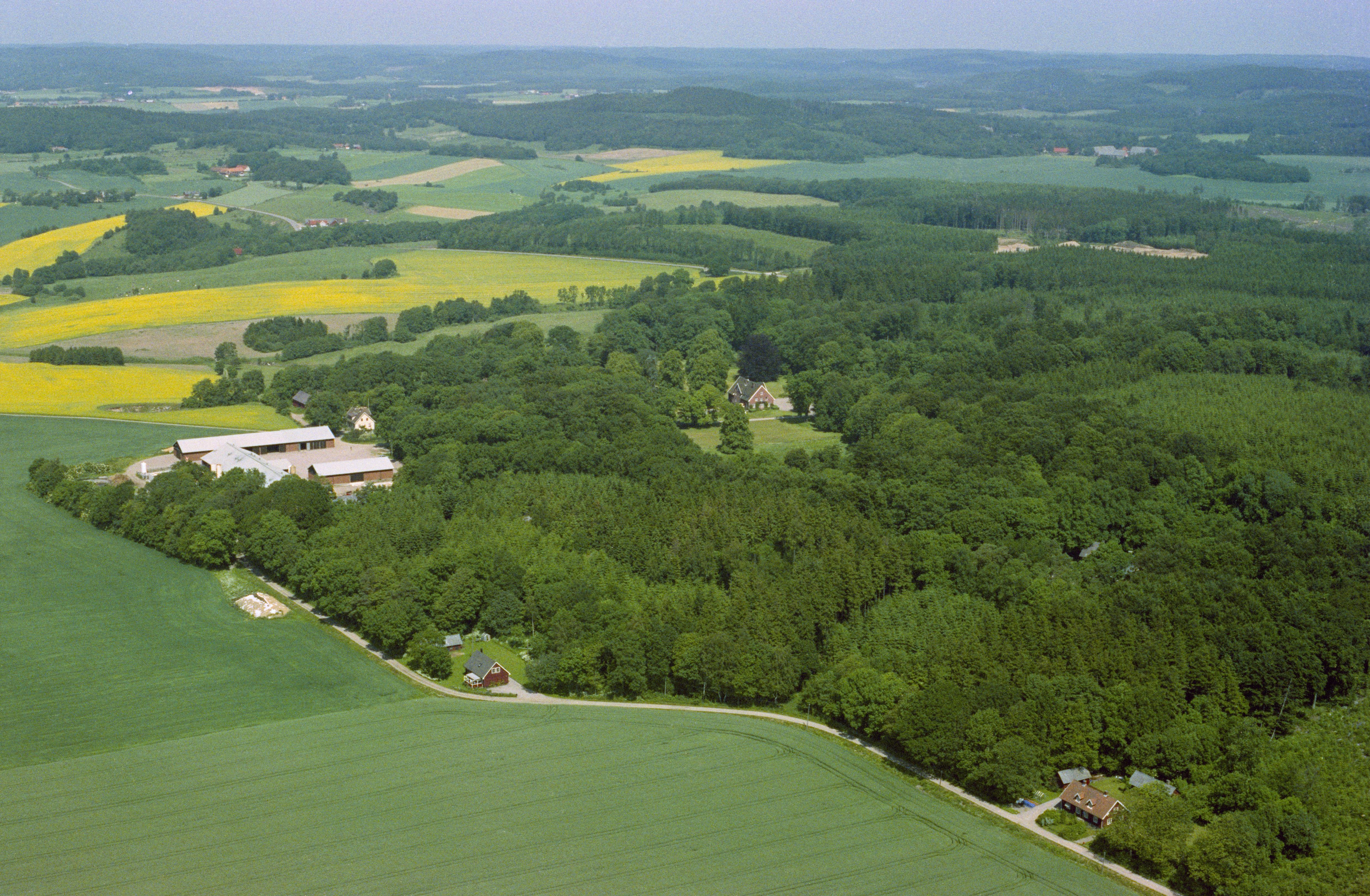 Beskrivning: Sannarps gård till vänster. Uppe till höger skymtas ett stenbrott (nära fornlämningar, bl.a. RAÄnr Årstad 3:1). Bilden är tagen mot (väderstreck): NO