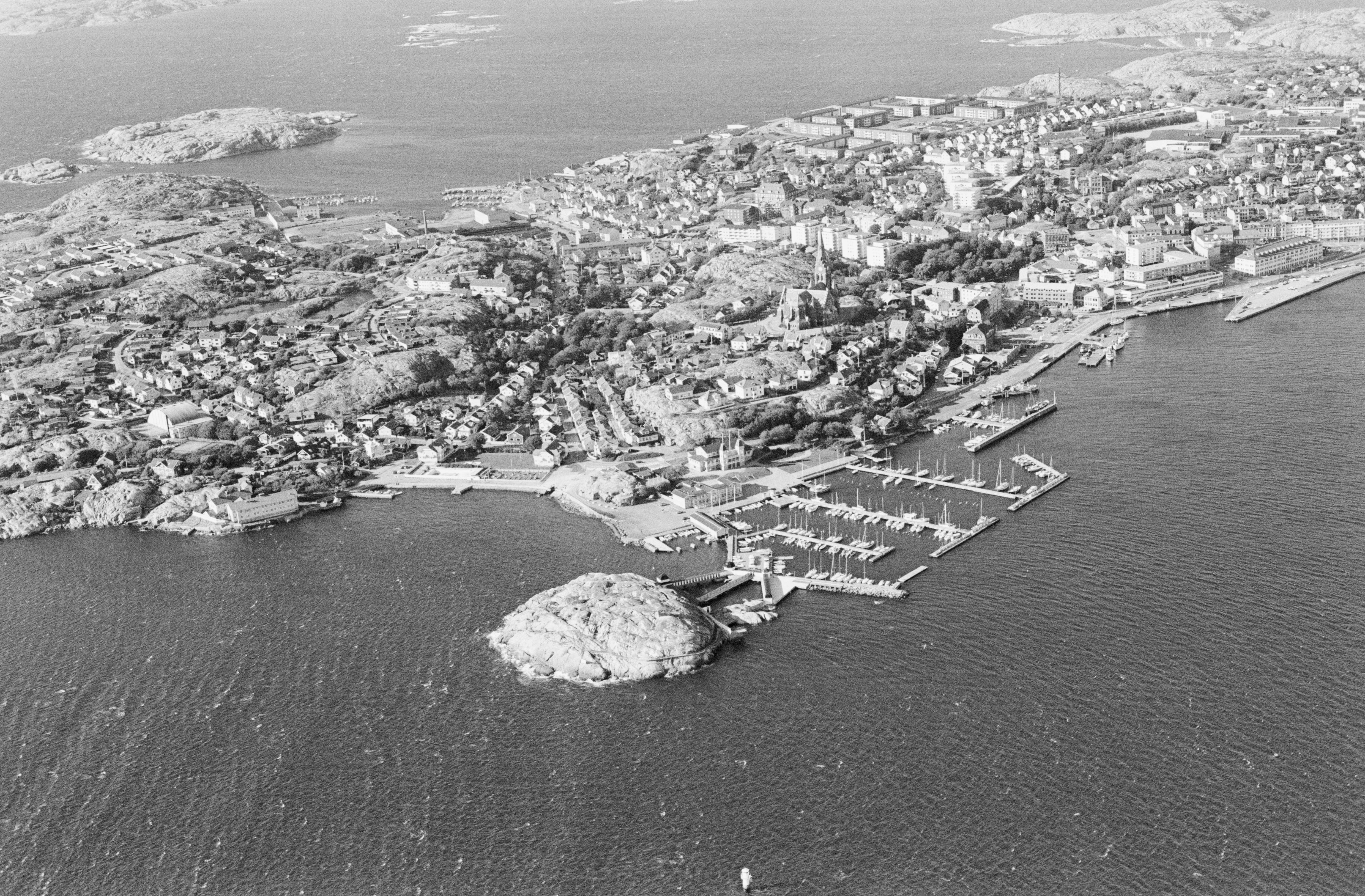 Beskrivning: Lysekils stad. Släggö vid Lysekils södra hamn. Lyse kyrka till höger om bildens mitt. Bilden är tagen mot (väderstreck): NV