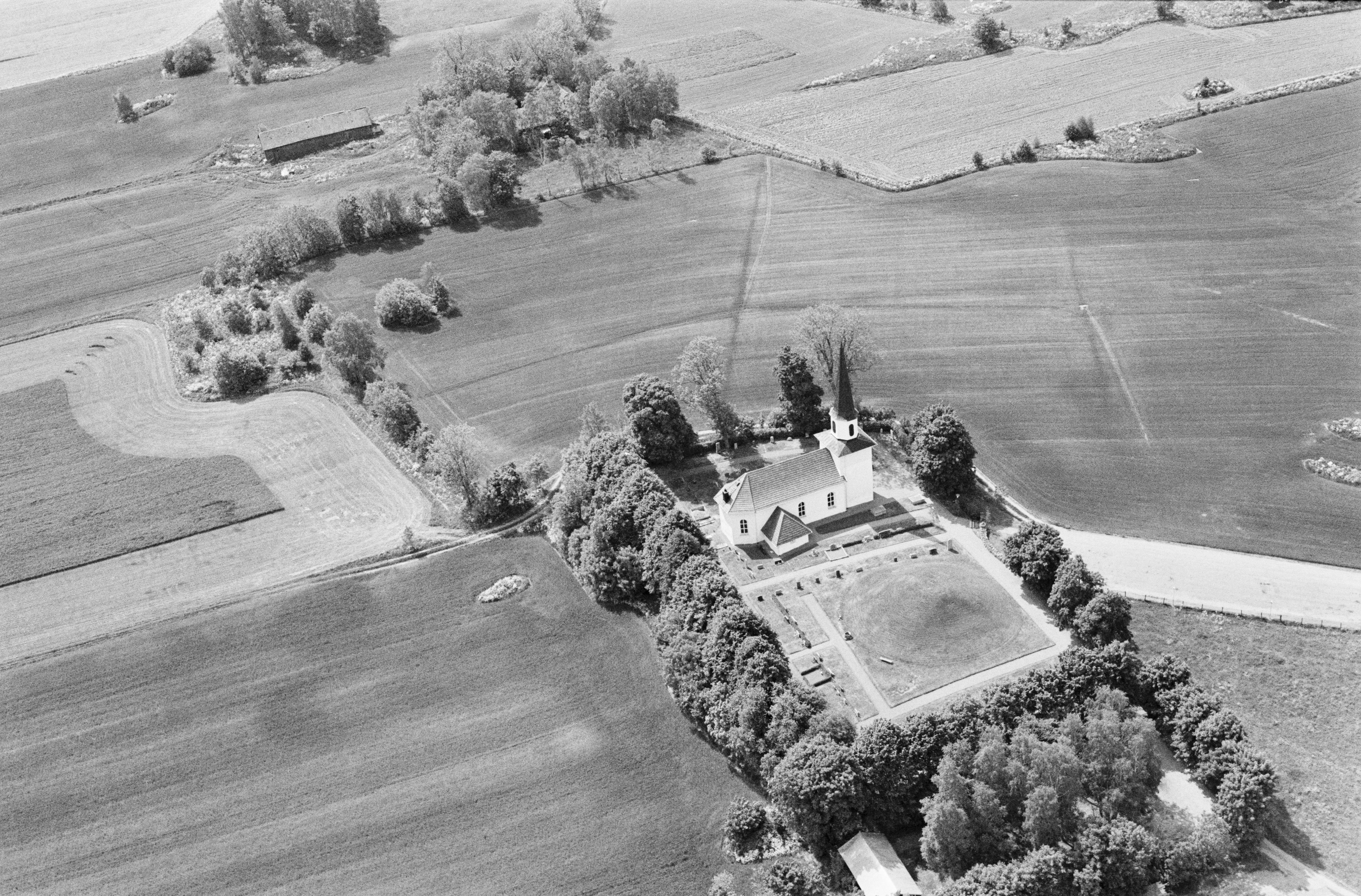 Beskrivning: Flistads kyrka och storhögen "kung Ranes hög" RAÄnr Flistad 12:1. Bilden är tagen mot (väderstreck): SV