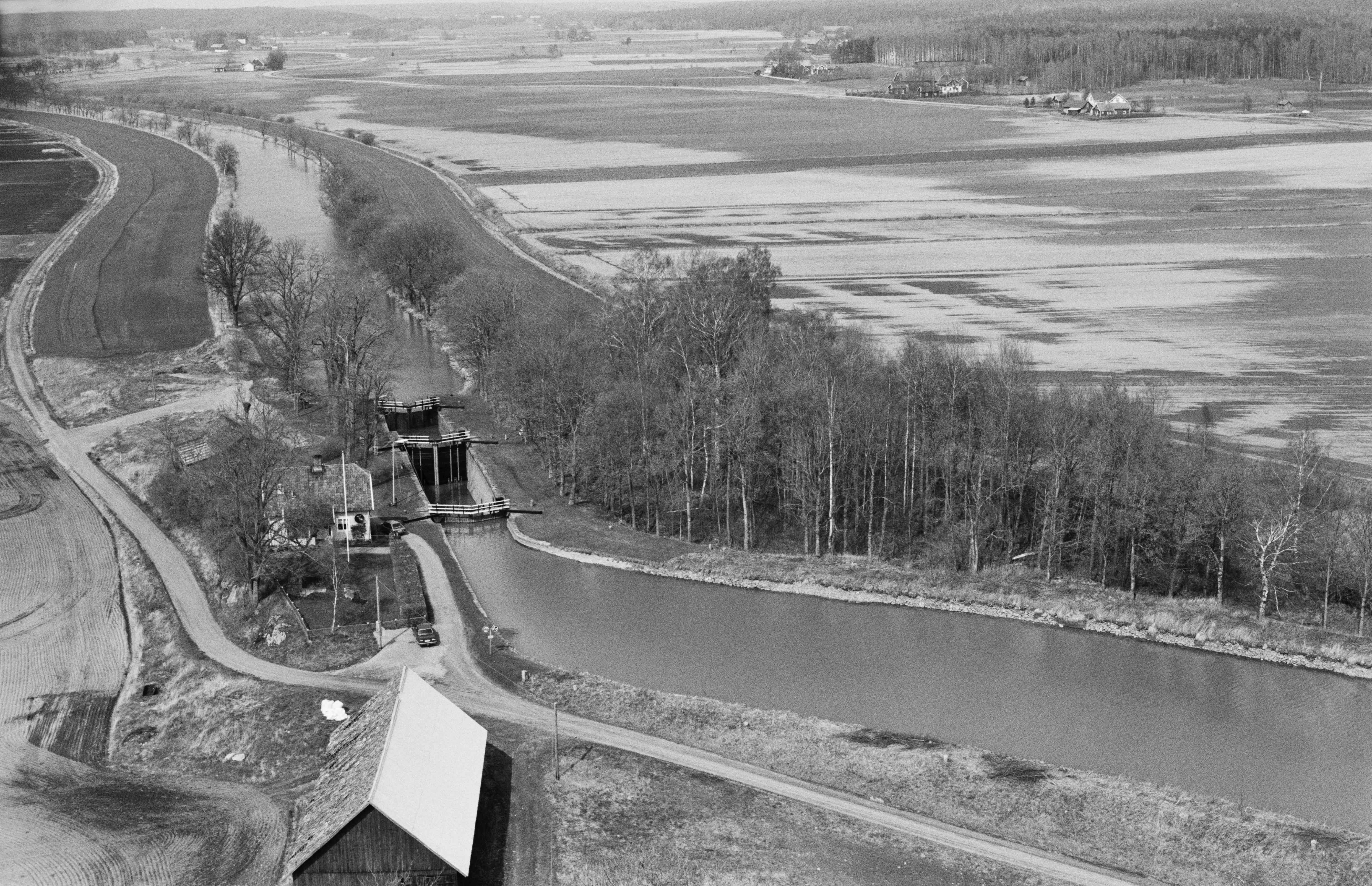 Beskrivning: Göta kanal, sluss vid Godhögen i norra delen av Mårby. Kanalmärke RAÄnr Fredsberg 45:1 i omårdet uppe till vänster. Bilden är tagen mot (vädersreck): NV