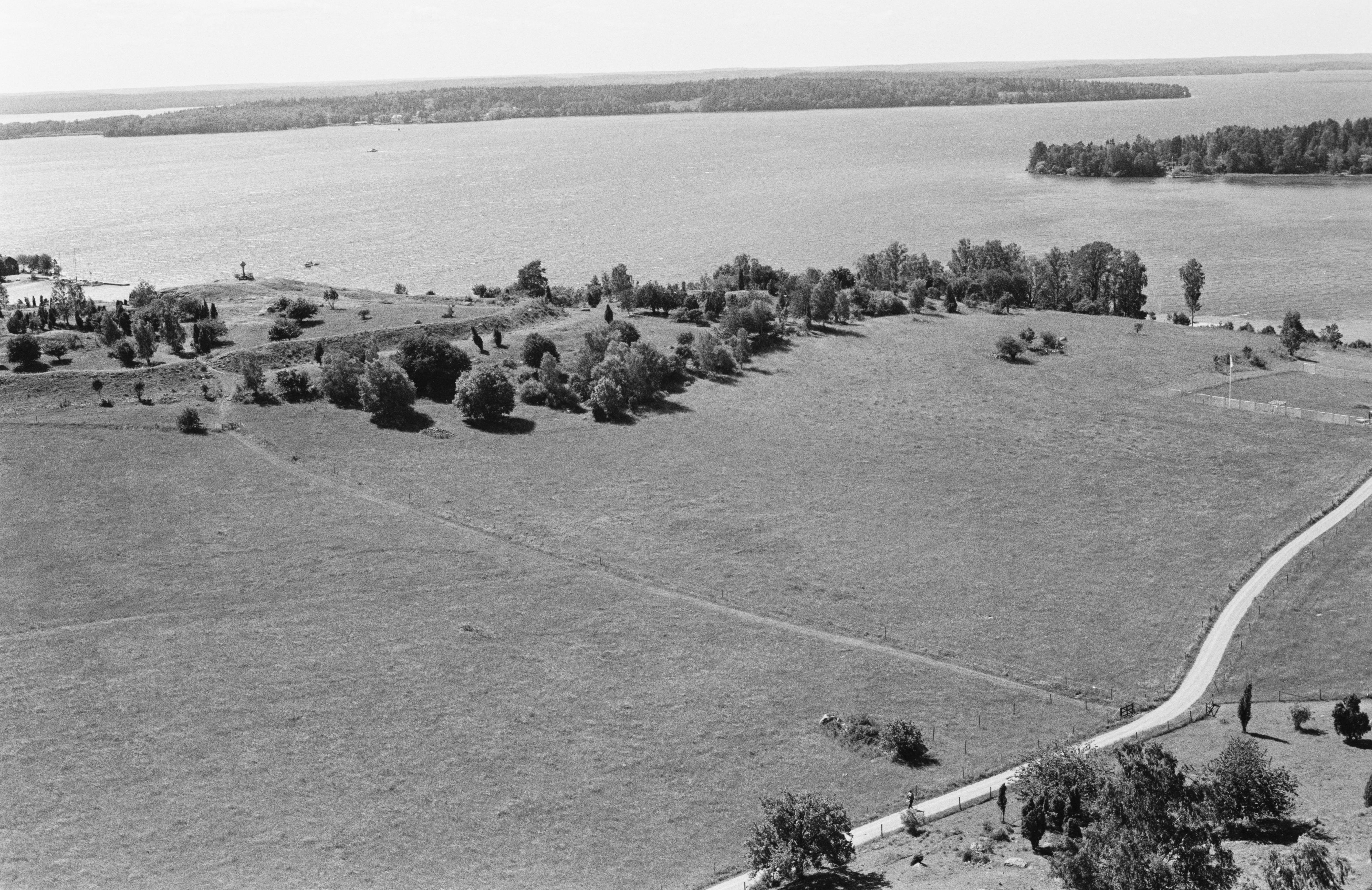 Beskrivning: Fornlämningsområdet Birka på Björkö i Mälaren. Uppe till höger arkeologisk undersökning i norra delen av ön i området Hemlanden och Svarta jorden RAÄnr Adelsö 118:1 vid Stadsvallen Adelsö 119:1-2. Bilden är tagen mot (väderstreck): V