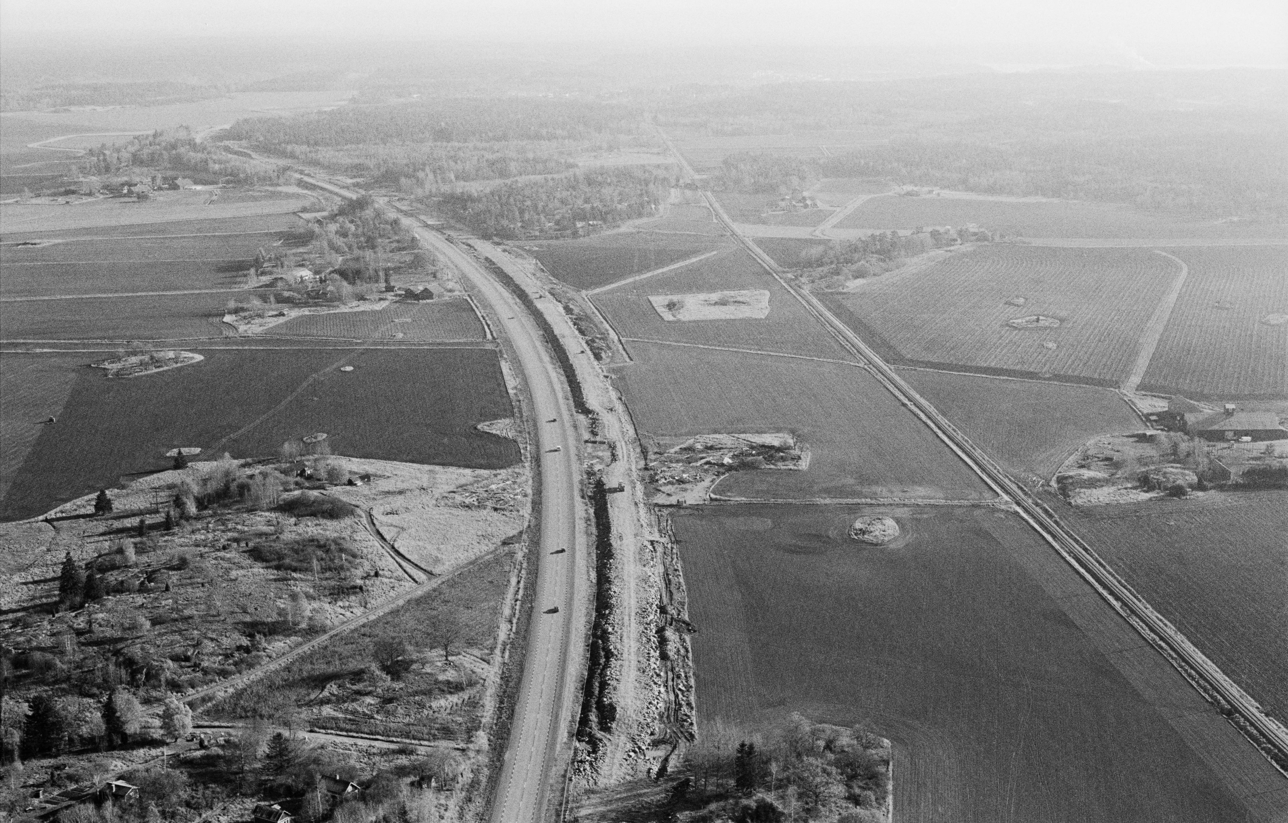 Beskrivning: Arkeologiska undersökningar innan bygge av väg E18 vid Apalle, Högsta och Pollista. Nere till vänster gravfält Dragonbacken RAÄnr Övergran 9:1. Vid bildens mitt Pollista gamla tomt RAÄnr Övergran 228:1. Över bildens mitt Högsta gamla tomt. Bilden är tagen mot (väderstreck): Ö