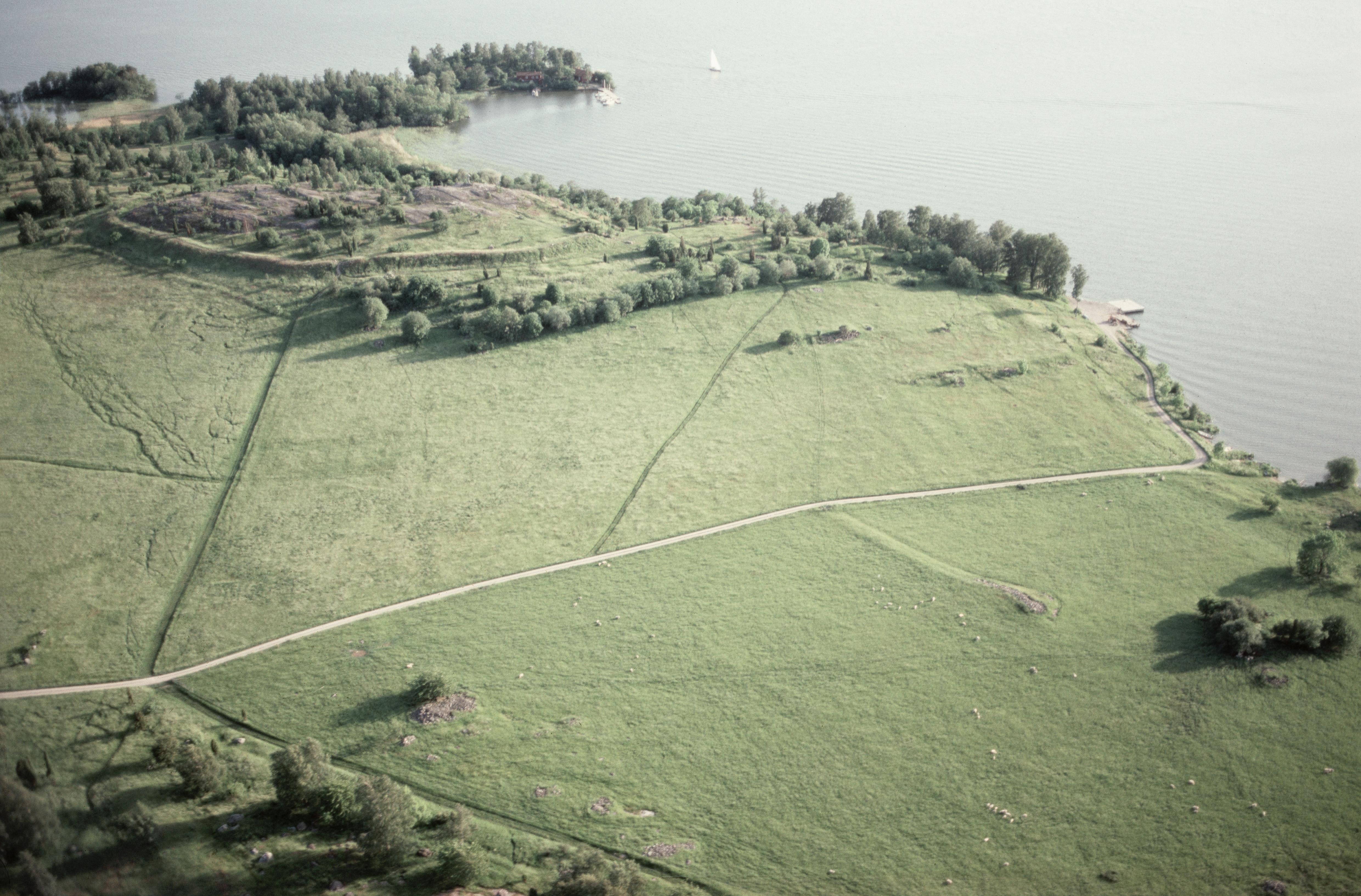 Beskrivning: Fornlämningsområdet Birka på Björkö i Mälaren. Norra delen av ön vid Ångholmen, fornborg RAÄnr Adelsö 34:1, Hemlanden och Svarta jorden Adelsö 118:1 vid Stadsvallen Adelsö 119:1-2 m.fl. Bilden är tagen mot (väderstreck): SSV