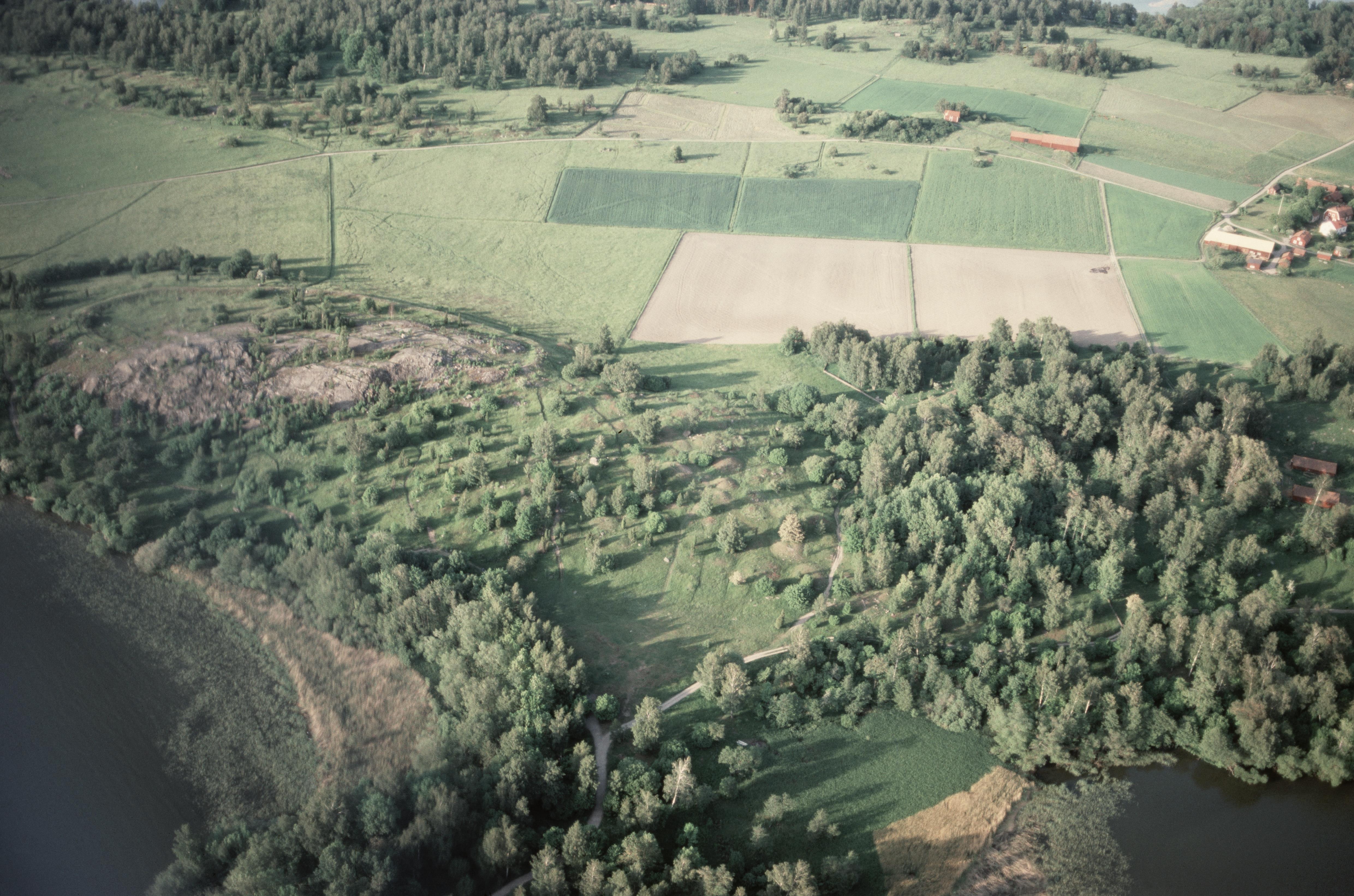 Beskrivning: Fornlämningsområdet Birka på Björkö i Mälaren. Ängholmen, fornborg Borg RAÄnr Adelsö 34:1, gravfält Borgs hage Adelsö 35:1 m.fl. I bildens övre del Grindsbacka och Björkö by. Bilden är tagen mot (väderstreck): NO