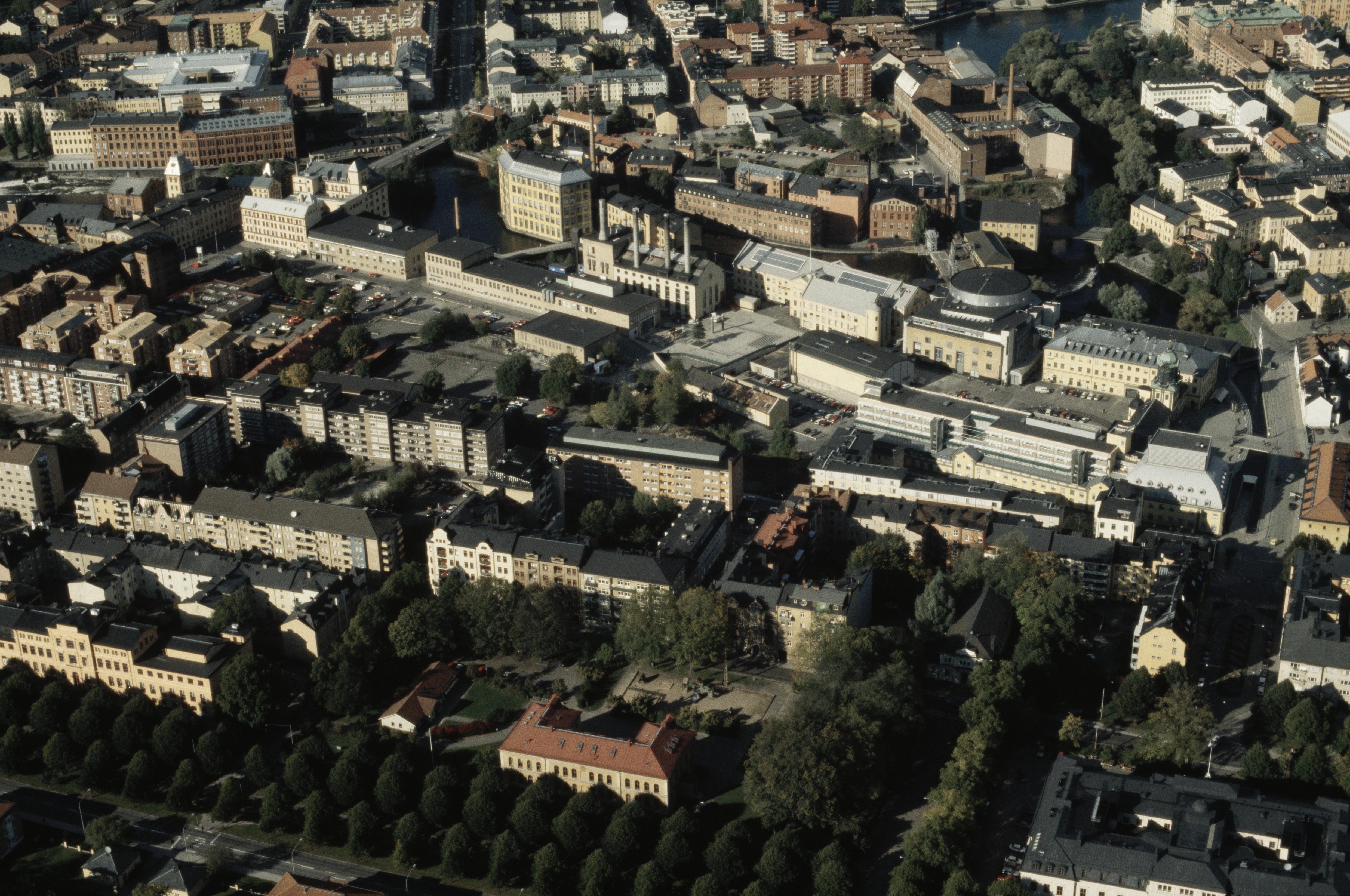 Beskrivning: Ån Motala ström (i bildens övre del) i Norrköpings stad. Stadsdelen Berget. Bilden är tagen mot (väderstreck): N