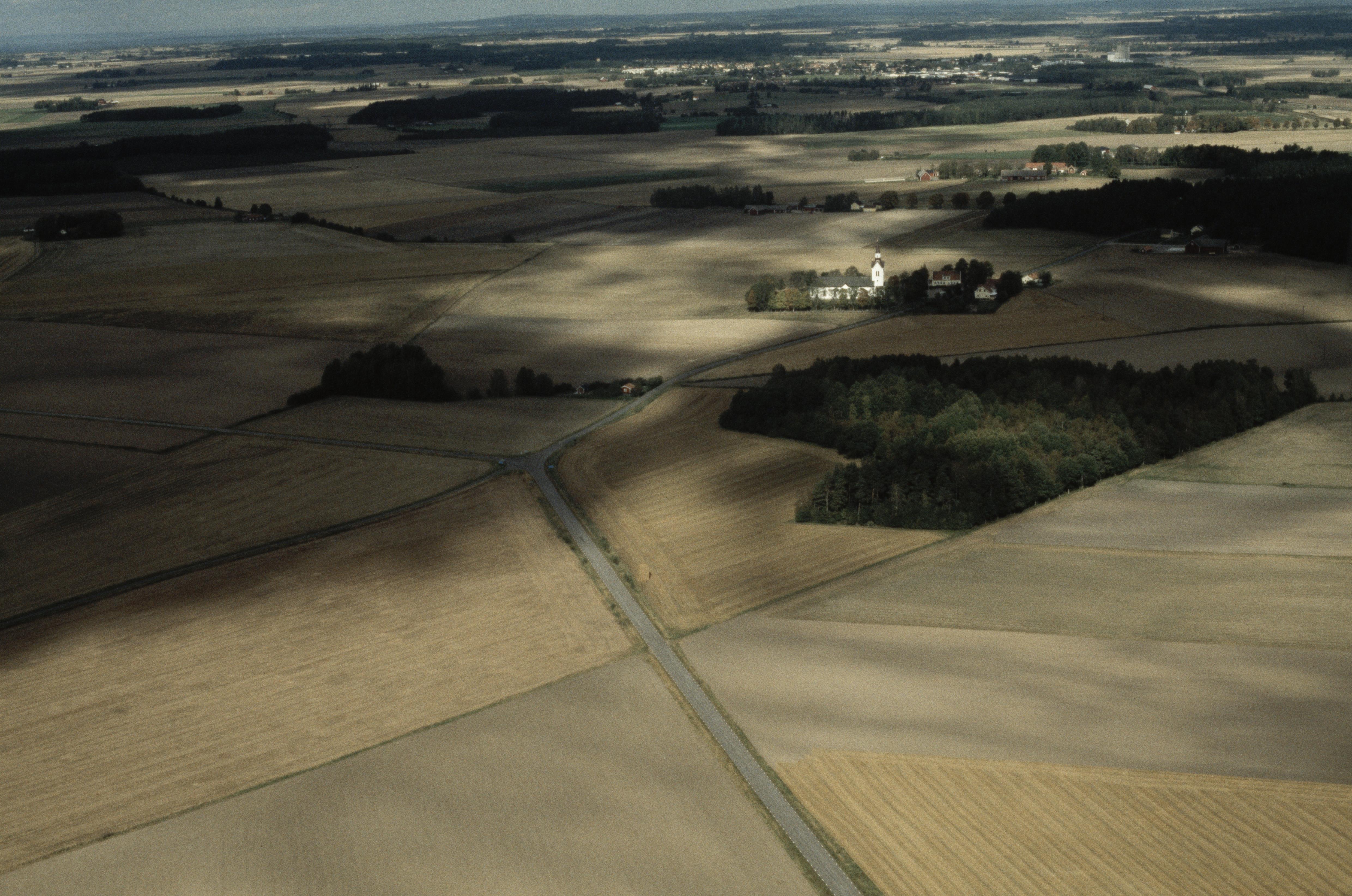 Beskrivning: Högby kyrka. I bildens övre del Skänninge tätort i Skänninge socken. Bilden är tagen mot (väderstreck): N