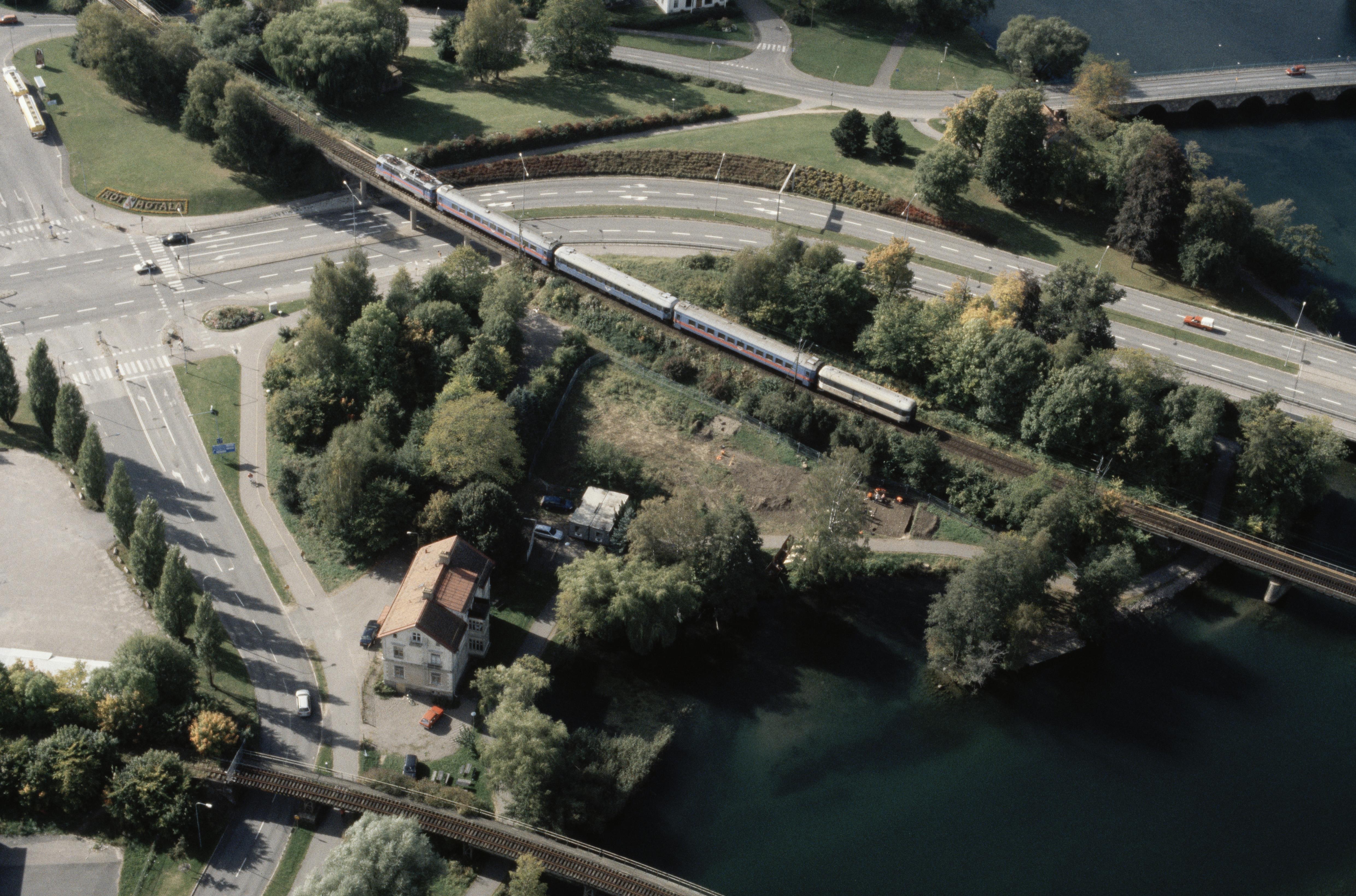 Beskrivning: Motala tätort. Arkeologisk undersökning av boplats RAÄnr Motala 290 vid järnvägsbron över Motala ström. Bilden är tagen mot (vädersträck): V