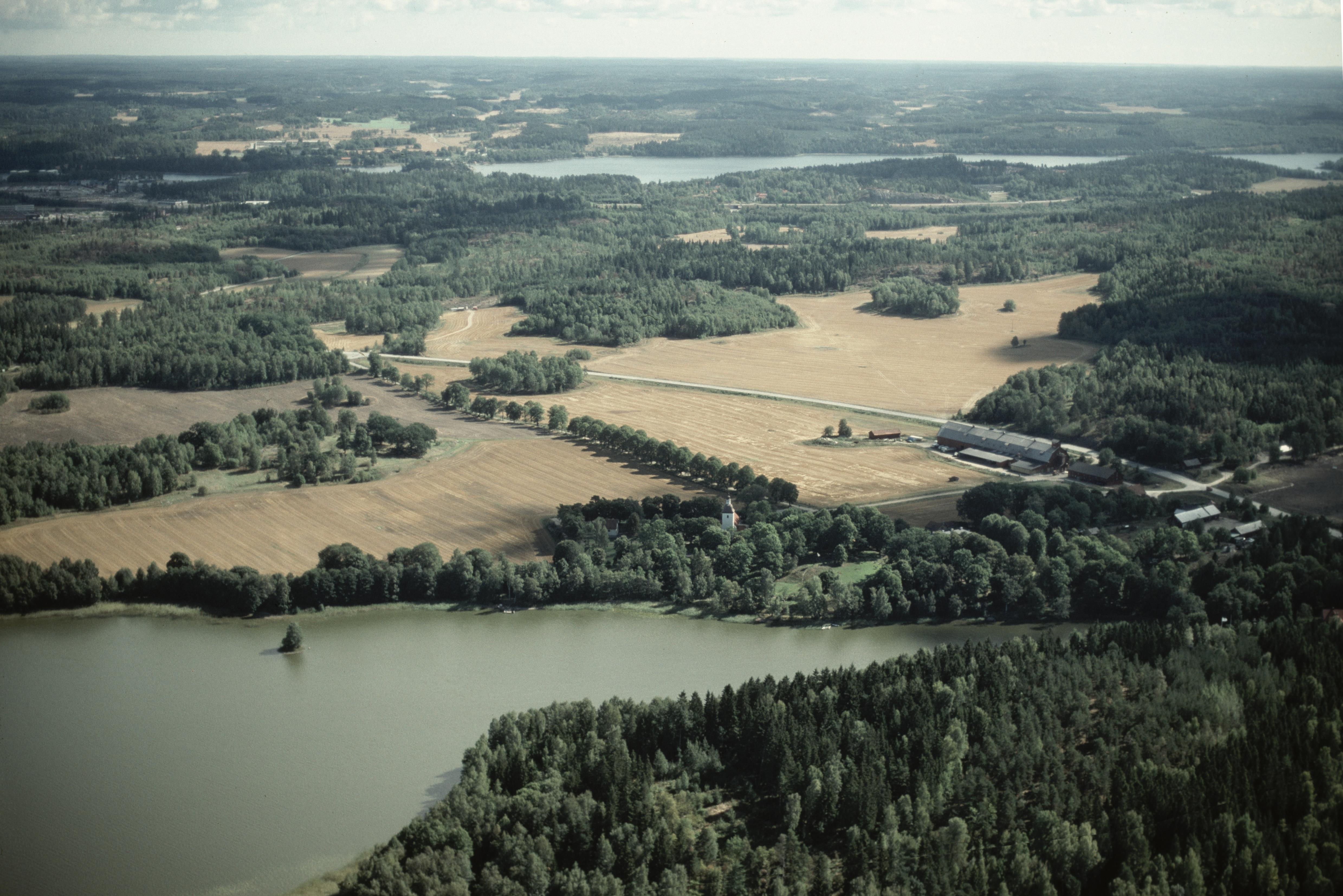 Beskrivning: Södra delen av sjön Måsnaren. Tveta kyrka under bildens mitt. Vid kyrkan gravfält RAÄnr Tveta 68:1. Tvetaberg till höger. Bilden är tagen mot (väderstreck): SSO