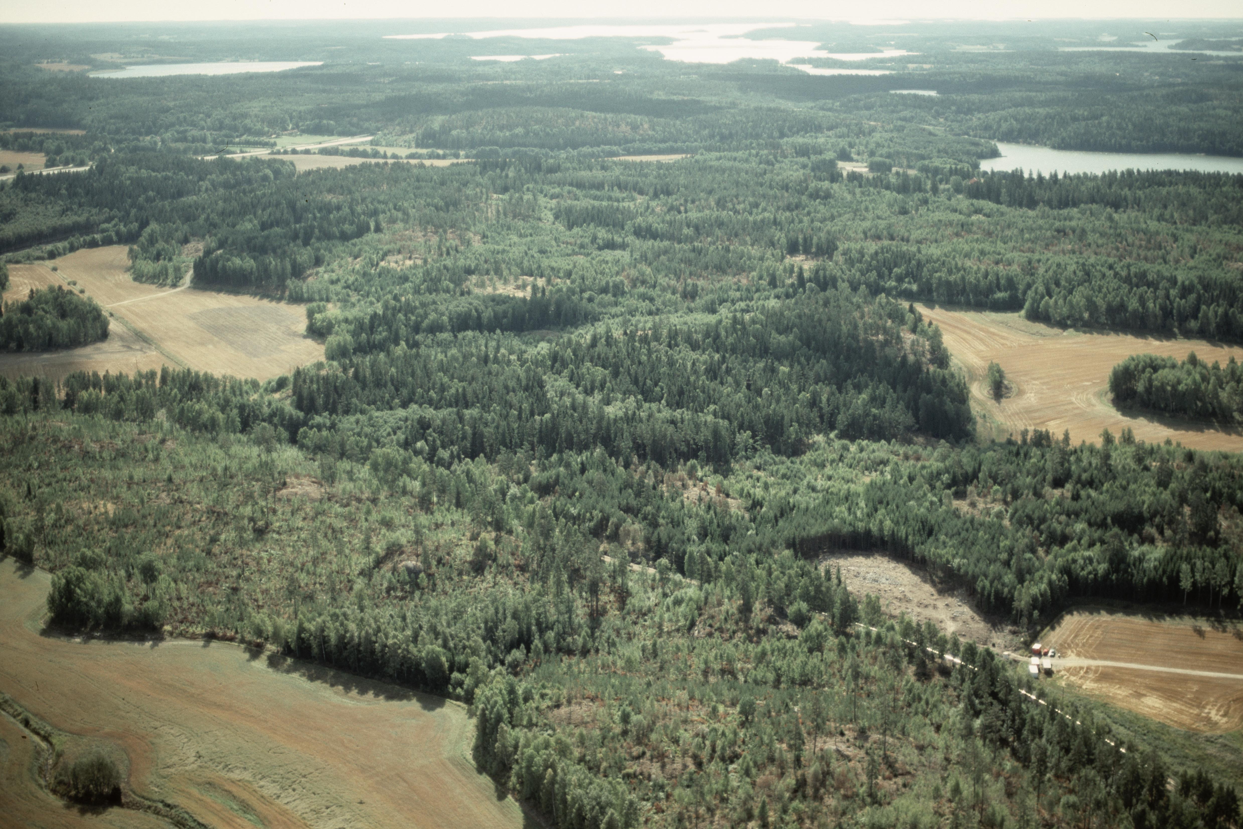 Beskrivning: Nere till höger arkeologisk undersökning innan järnvägen Grödingebanan byggs. Vid bildens mitt boplats RAÄnr Tveta 164:1 vid den gamla järnvägssträckan. Bilden är tagen mot (väderstreck): SSO
