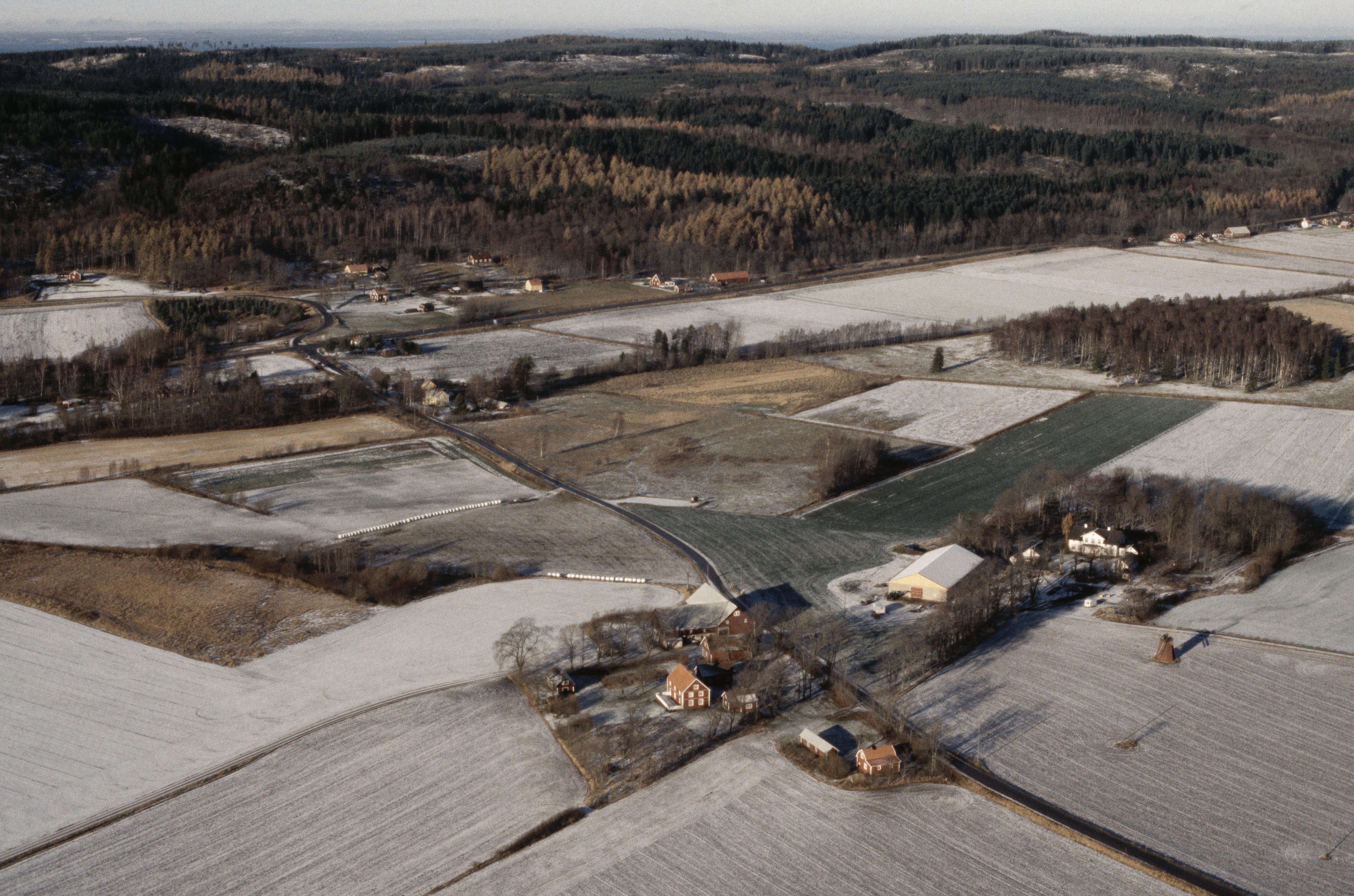 Beskrivning: Stora Broby gård norröst om Alvastra kloster. Boplats RAÄnr Västra Tollstad 22:1 vid bildens mitt. Väderkvarn nere till höger. Bilden är tagen mot (väderstreck): N