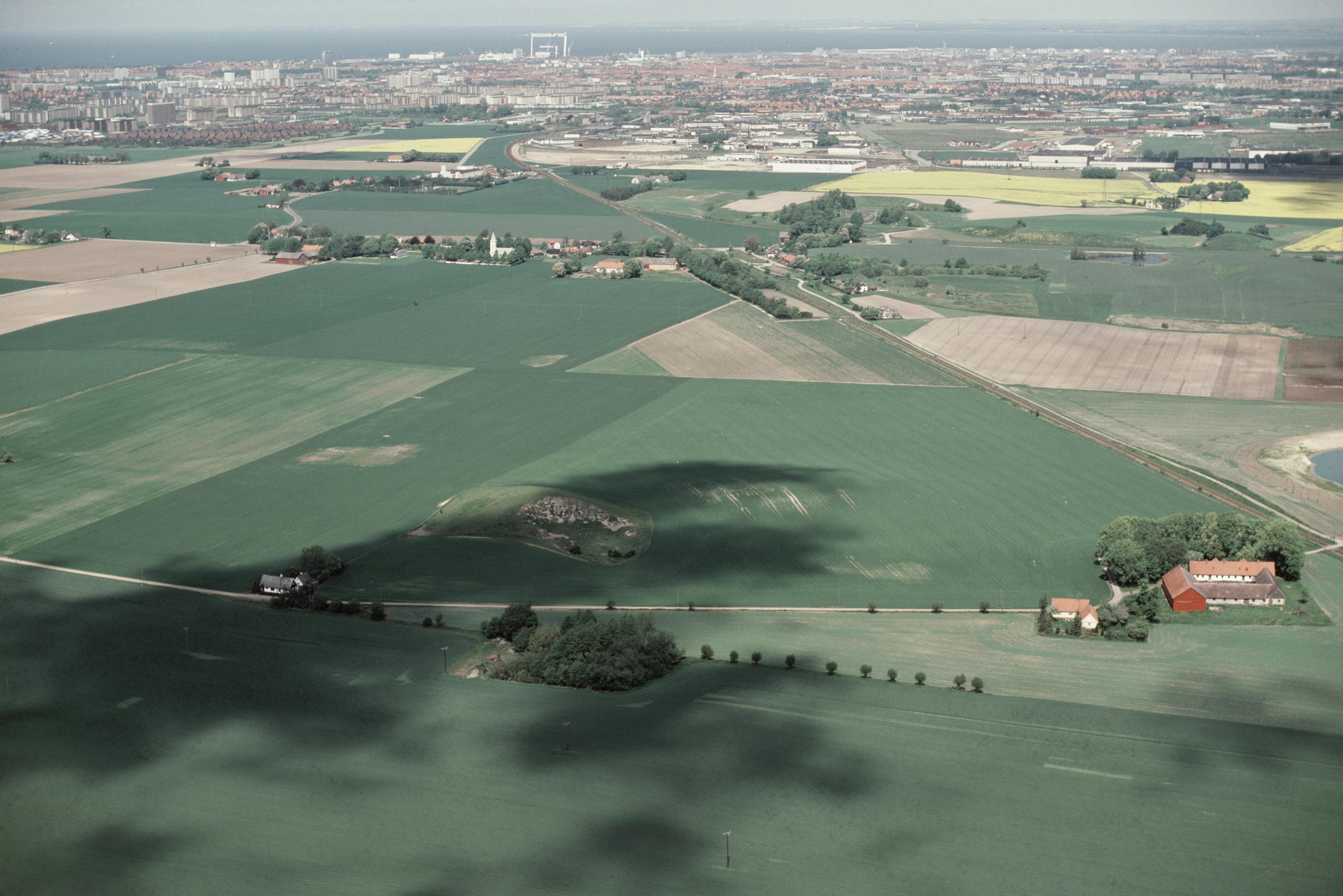 Beskrivning: Lockarps kyrka till vänster över bildens mitt. I bildens övre del Malmö stad (med Kockumskranen i Malmö hamn). Bilden är tagen mot (väderstreck): NV
