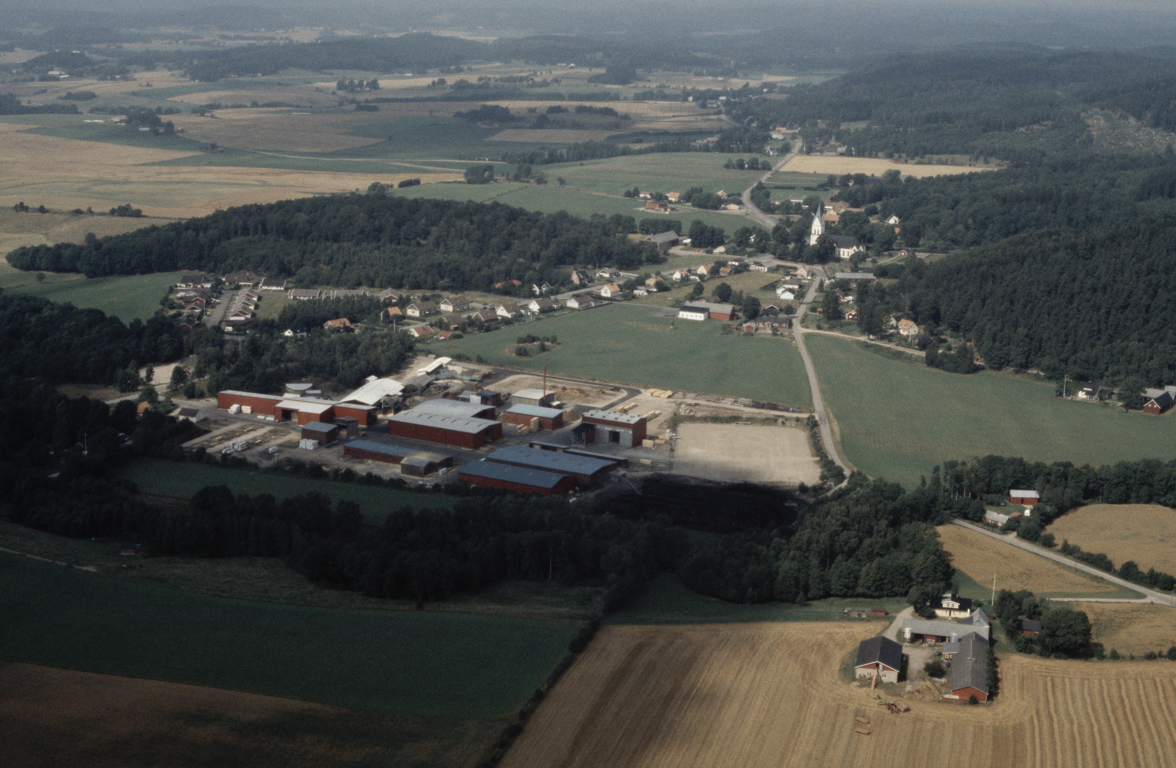 Beskrivning: Okome kyrka (uppe till höger) och kyrkby i Ätradalen. Bilden är tagen mot (väderstreck): N