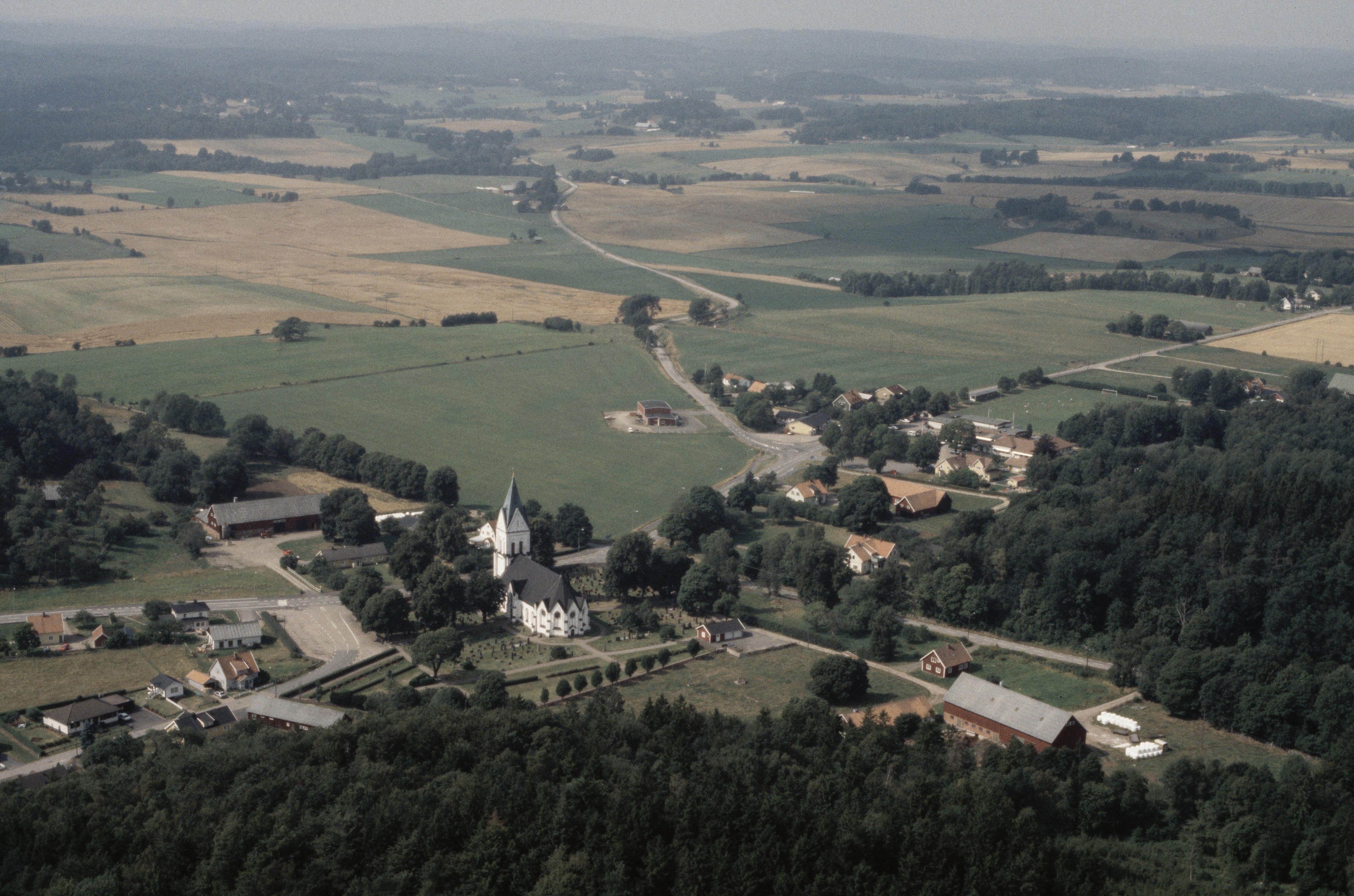 Beskrivning: Okome kyrka och kyrkby i Ätradalen. Bilden är tagen mot (väderstreck): NV